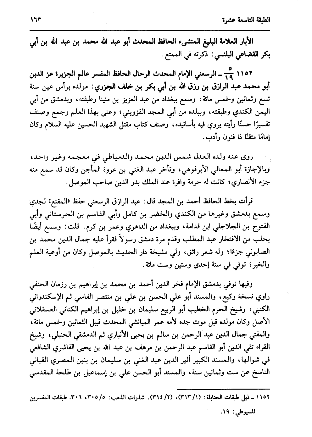 1152- ذيل طبقات الحنابلة: "1/ 313"، "2/ 314". شذرات الذهب: 5/ 305، 306. طبقات المفسرين للسيوطي: 19.