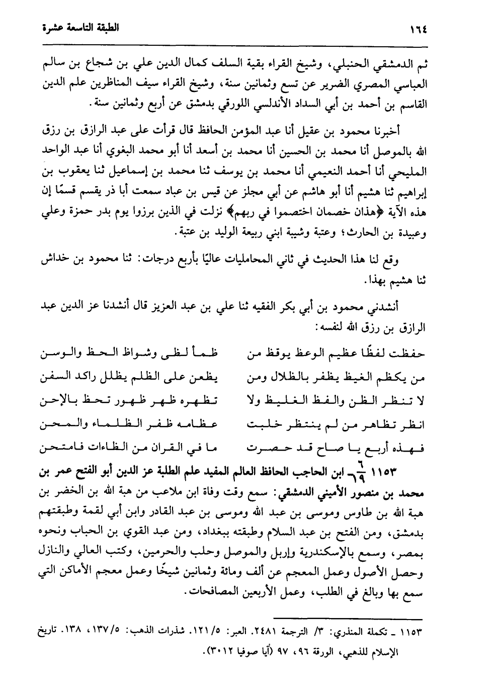 1153- 6/19- ابن الحاجب الحافظ العالم المفيد, علم الطلبة عز الدين أبو الفتح عمر بن محمد بن منصور الأميني الدمشقي: سمع وقت وفاة ابن ملاعب من هبة الله بن الخضر بن هبة الله بن طاوس وموسى بن عبد الله وموسى بن عبد القادر وابن أبي لقمة وطبقتهم بدمشق، ومن الفتح بن عبد السلام وطبقته ببغداد، ومن عبد القوي بن الحباب ونحوه بمصر، وسمع بالإسكندرية وإربل والموصل وحلب والحرمين، وكتب العالي والنازل وحصل الأصول وعمل المعجم عن ألف ومائة وثمانين شيخًا, وعمل معجم الأماكن التي سمع بها وبالغ في الطلب، وعمل الأربعين المصافحات.
