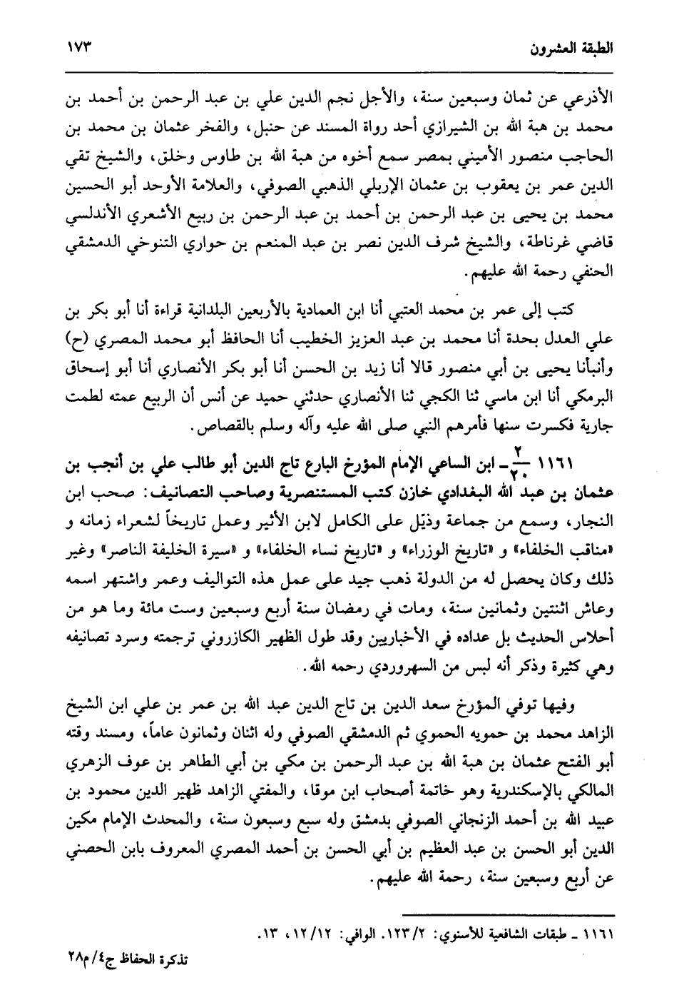 1161- 2/20- ابن الساعي الإمام المؤرخ البارع تاج الدين أبو طالب علي بن أنجب بن عثمان بن عبد الله البغدادي, خازن كتب المستنصرية وصاحب التصانيف: صحب ابن النجار، وسمع من جماعة وذيل على الكامل لابن الأثير وعمل تاريخًا لشعراء زمانه و"مناقب الخلفاء" و"تاريخ الوزراء" و"تاريخ نساء الخلفاء" و"سيرة الخليفة الناصر" وغير ذلك, وكان يحصل له من الدولة ذهب جيد على عمل هذه التواليف وعمر واشتهر اسمه وعاش اثنتين وثمانين سنة، ومات في رمضان سنة أربع وسبعين وستمائة وما هو من أحلاس الحديث بل عداده في الأخباريين وقد طول الظهير الكازروني ترجمته وسرد تصانيفه وهي كثيرة, وذكر أنه لبس من السهروردي, رحمه الله.