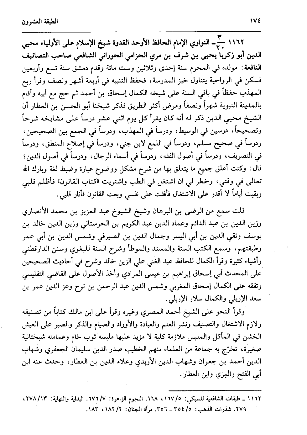 1162- 3/20- النواوي الإمام الحافظ الأوحد القدوة شيخ الإسلام علم الأولياء, محيي الدين أبو زكريا يحيى بن شرف بن مري الحزامي الحوراني الشافعي, صاحب التصانيف النافعة: مولده في المحرم سنة إحدى وثلاثين وستمائة وقدم دمشق سنة تسع وأربعين فسكن في الرواحية يتناول خبز المدرسة، فحفظ التنبيه في أربعة أشهر ونصف وقرأ ربع المهذب حفظًا في باقي السنة على شيخه الكمال إسحاق بن أحمد ثم حج مع أبيه وأقام بالمدينة النبوية شهرًا ونصفًا ومرض أكثر الطريق, فذكر شيخنا أبو الحسن بن العطار أن الشيخ محيي الدين ذكر له أنه كان يقرأ كل يوم اثني عشر درسًا على مشايخه شرحًا وتصحيحًا؛ درسين في الوسيط، ودرسًا في المهذب، ودرسًا في الجمع بين الصحيحين، ودرسًا في صحيح مسلم، ودرسًا في اللمع لابن جني، ودرسًا في إصلاح المنطق، ودرسًا في التصريف، ودرسًا في أصول الفقه، ودرسًا في أسماء الرجال، ودرسًا في أصول الدين؛ قال: وكنت أعلق جميع ما يتعلق بها من شرح مشكل ووضوح عبارة وضبط لغة وبارك الله تعالى في وقتي، وخطر لي أن أشتغل في الطب واشتريت "كتاب القانون" فأظلم قلبي وبقيت أيامًا لا أقدر على الاشتغال فأفقت على نفسي وبعت القانون فأنار قلبي.