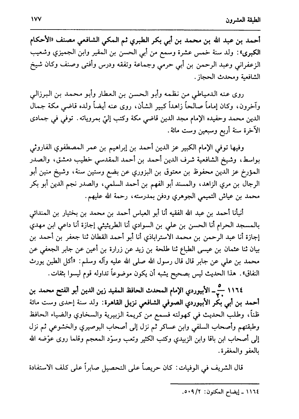 أحمد بن عبد الله بن محمد بن أبي بكر الطبري ثم المكي الشافعي, مصنف "الأحكام الكبرى": ولد سنة خمس عشرة وسمع من أبي الحسن بن المقير وابن الجميزي وشعيب الزعفراني وعبد الرحمن بن أبي حرمي وجماعة وتفقه ودرس وأفتى وصنف وكان شيخ الشافعية ومحدث الحجاز.