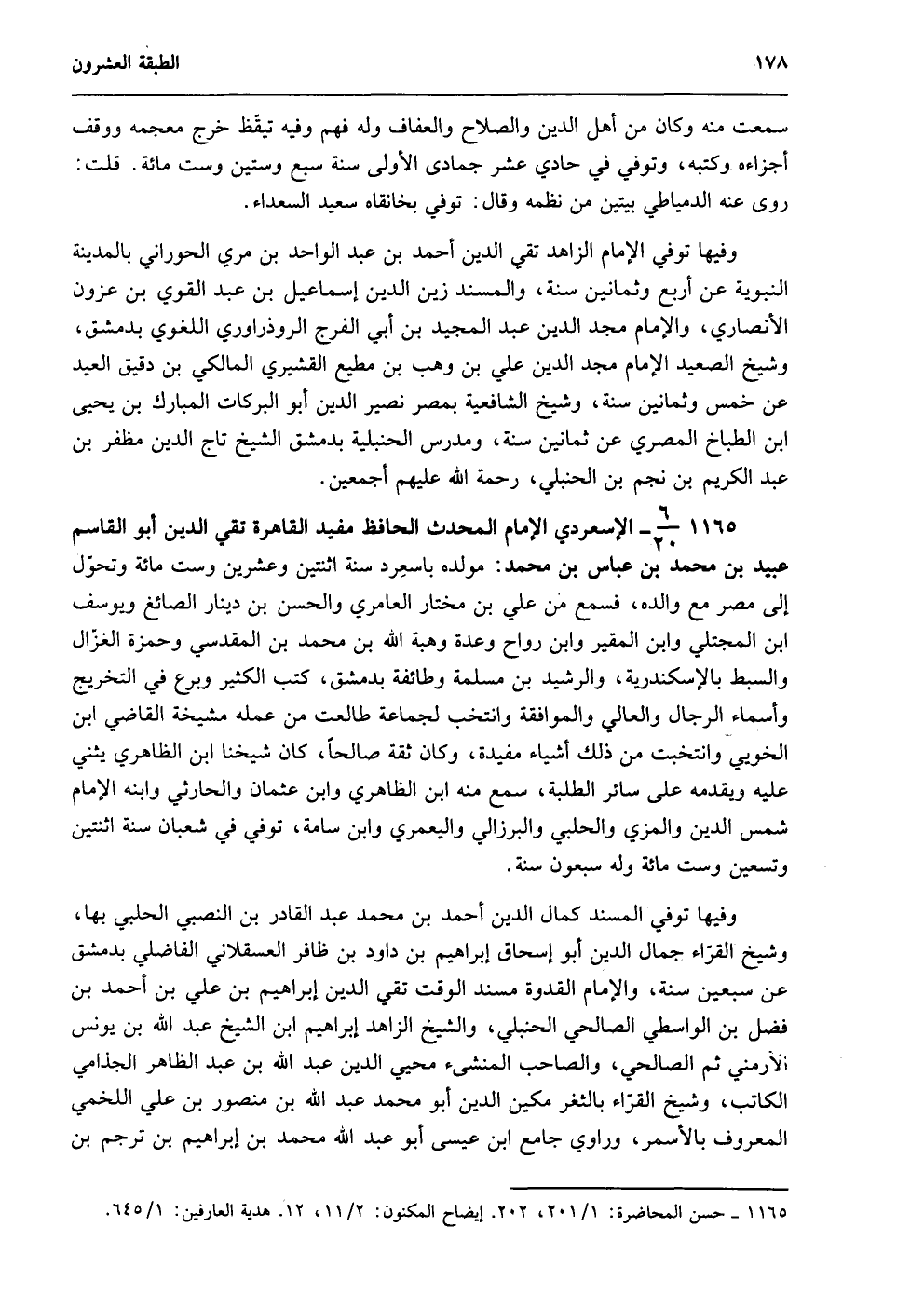 1165- 6/20- الإسعردي الإمام المحدث الحافظ مفيد القاهرة, تقي الدين أبو القاسم عبيد بن محمد بن عباس بن محمد: مولده بإسعِرد سنة اثنتين وعشرين وستمائة وتحول إلى مصر مع والده، فسمع من علي بن مختار العامري والحسن بن دينار الصائغ ويوسف بن المجتلي وابن المقير وابن رواح وعدة وهبة الله بن محمد بن المقدسي وحمزة الغزال والسبط بالإسكندرية، والرشيد بن مسلمة وطائفة بدمشق، كتب الكثير وبرع في التخريج وأسماء الرجال والعالي والموافقة وانتخب لجماعة, طالعت من عمله مشيخة القاضي ابن الخويي وانتخبت من ذلك أشياء مفيدة، وكان ثقة صالحًا، كان شيخنا ابن الظاهري يثني عليه ويقدمه على سائر الطلبة، سمع منه ابن الظاهري وابن عثمان والحارثي وابنه الإمام شمس الدين والمزي والحلبي والبرزالي واليعمري وابن سامة، توفي في شعبان سنة اثنتين وتسعين وستمائة وله سبعون سنة.