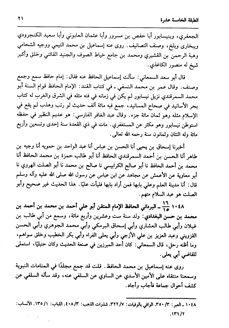 1048- العبر: 3/ 350. الوافي بالوفيات: 7/ 322. شذرات الذهب: 3/ 408. اللباب: 1/ 135. الأنساب: 2/ 136.