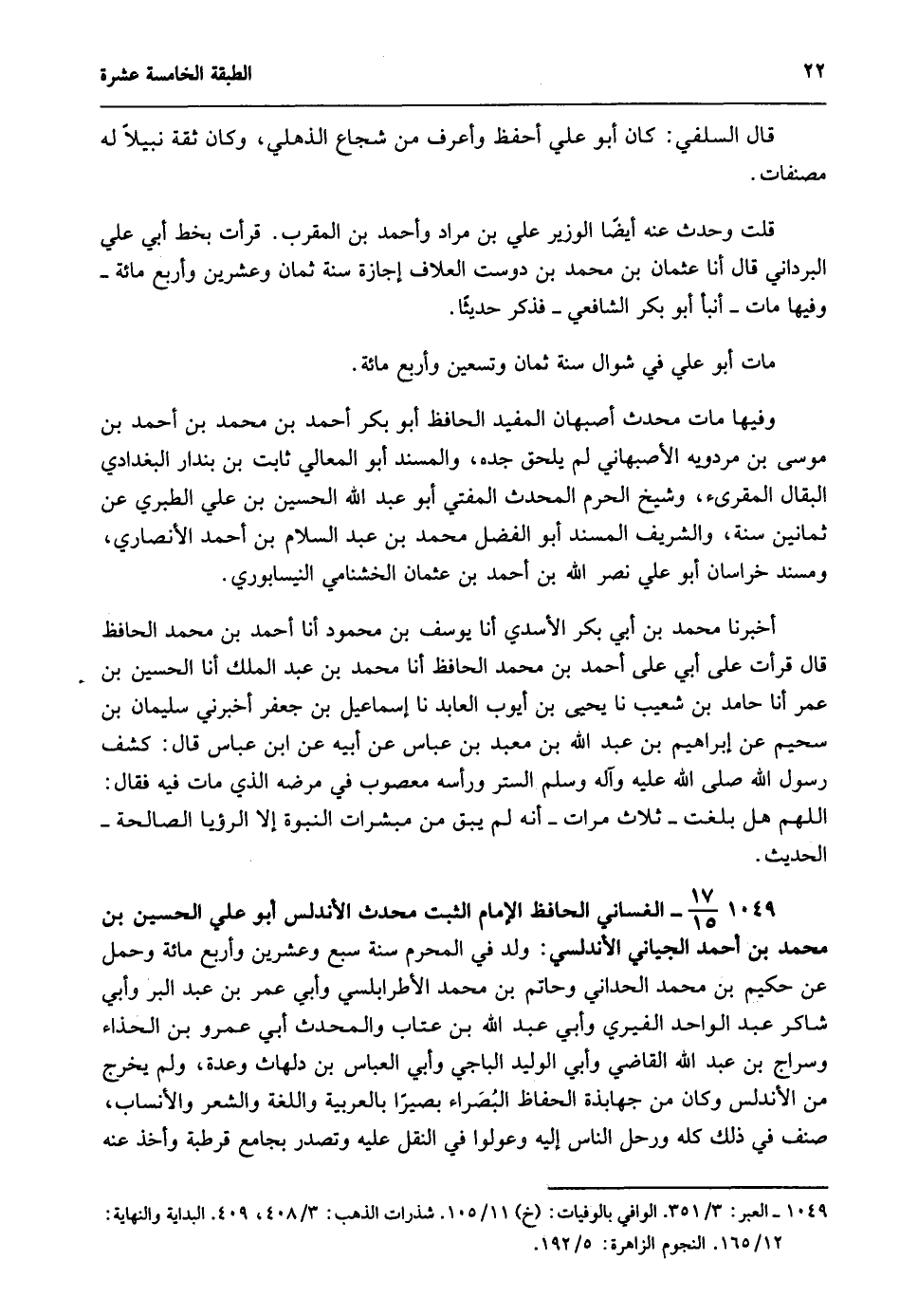 1049- 17/15- الغساني الحافظ الإمام الثبت محدث الأندلس أبو علي الحسين بن محمد بن أحمد الجياني الأندلسي: ولد في المحرم سنة سبع وعشرين وأربعمائة وحمل عن حكيم بن محمد الحداني وحاتم بن محمد الأطرابلسي وأبي عمر بن عبد البر وأبي شاكر عبد الواحد الفيري وأبي عبد الله بن عتاب والمحدث أبي عمرو بن الحذاء وسراج بن عبد الله القاضي وأبي الوليد الباجي وأبي العباس بن دلهاث وعدة، ولم يخرج من الأندلس وكان من جهابذة الحفاظ البُصَراء بصيرًا بالعربية واللغة والشعر والأنساب، صنف في ذلك كله, ورحل الناس إليه وعوَّلوا في النقل عليه وتصدر بجامع قرطبة وأخذ عنه