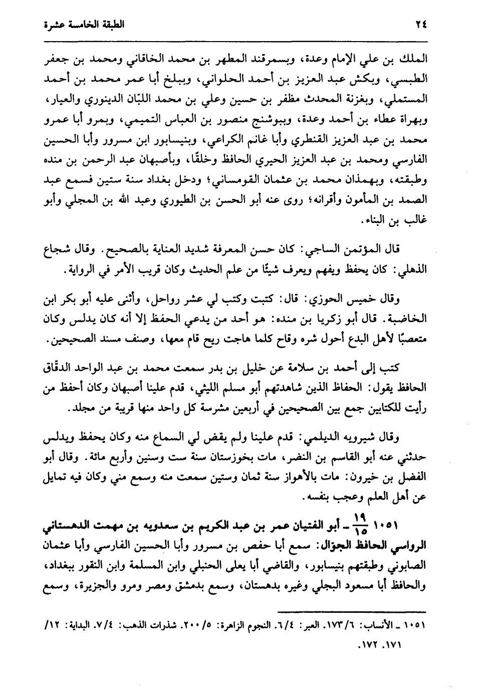 1051- 19/15- أبو الفتيان عمر بن عبد الكريم بن سعدويه بن مهمت الدهستاني الرواسي الحافظ الجوال: سمع أبا حفص بن مسرور وأبا الحسين الفارسي وأبا عثمان الصابوني وطبقتهم بنيسابور، والقاضي أبا يعلى الحنبلي وابن المسلمة وابن النقور ببغداد، والحافظ أبا مسعود البجلي وغيره بدهستان، وسمع بدمشق ومصر ومرو والجزيرة، وسمع