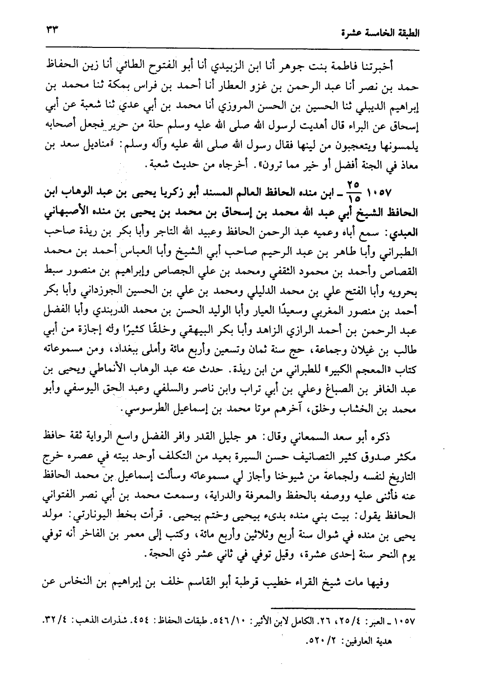 1057- 25/15- بن منده الحافظ العالم المسند أبو زكريا يحيى بن عبد الوهاب بن الحافظ الشيخ أبي عبد الله محمد بن إسحاق بن محمد بن يحيى بن منده الأصبهاني العبدي: سمع أباه وعميه: عبد الرحمن الحافظ وعبيد الله التاجر وأبا بكر بن ريذة صاحب الطبراني وأبا طاهر بن عبد الرحيم صاحب أبي الشيخ وأبا العباس أحمد بن محمد القصاص وأحمد بن محمود الثقفي ومحمد بن علي الجصاص وإبراهيم بن منصور سبط بحرويه وأبا الفتح علي بن محمد الدليلي ومحمد بن علي بن الحسين والجوزداني وأبا بكر أحمد بن منصور المغربي وسعيدًا العيار وأبا الوليد الحسن بن محمد الدربندي وأبا الفضل عبد الرحمن بن أحمد الرازي الزاهد وأبا بكر البيهقي وخلقًا كثيرًا, وله إجازة من أبي طالب بن غيلان وجماعة، حج سنة ثمان وتسعين وأربعمائة وأملى ببغداد، ومن مسموعاته كتاب "المعجم الكبير" للطبراني من بن ريذة. حدث عنه عبد الوهاب الأنماطي ويحيى بن عبد الغافر بن الصباغ وعلي بن أبي تراب وابن ناصر والسلفي وعبد الحق اليوسفي وأبو محمد بن الخشاب وخلق، آخرهم موتا محمد بن إسماعيل الطرسوسي.