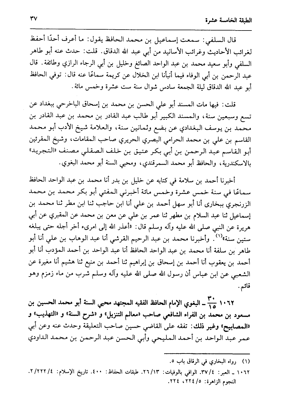 1062- 30/15- البغوي الإمام الحافظ الفقيه المجتهد محيي السنة أبو محمد الحسين بن مسعود بن محمد بن الفراء الشافعي صاحب "معالم التنزيل" و"شرح السنة" و"التهذيب" و"المصابيح" وغير ذلك: تفقه على القاضي حسين صاحب التعليقة وحدث عنه وعن أبي عمر عبد الواحد بن أحمد المليحي وأبي الحسن عبد الرحمن بن محمد الداودي
