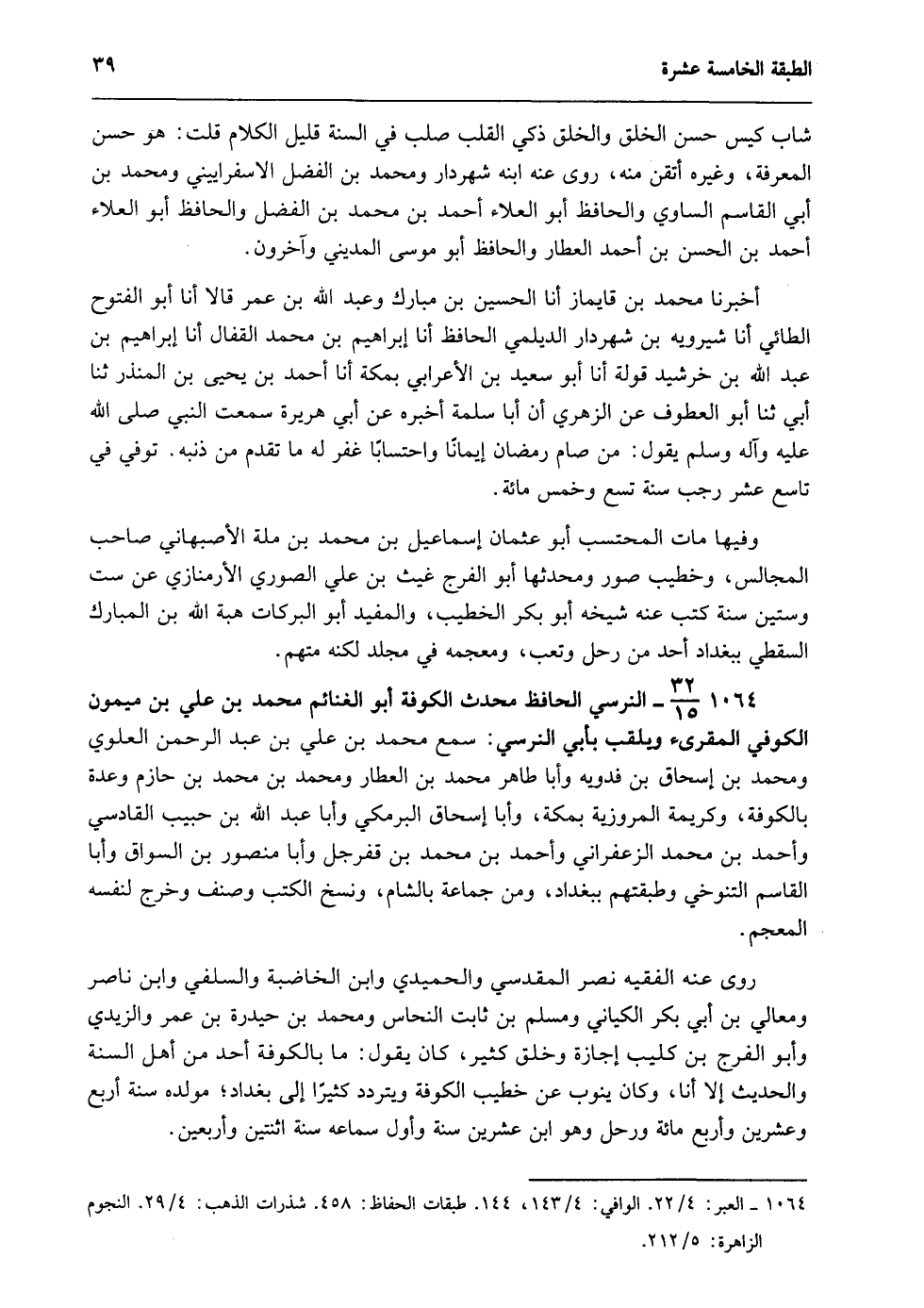 1064- 32/15- النرسي الحافظ محدث الكوفة, أبو الغنائم محمد بن علي بن ميمون الكوفي المقرئ ويلقب بأبي النرسي: سمع محمد بن علي بن عبد الرحمن العلوي ومحمد بن إسحاق بن فدويه وأبا طاهر محمد بن العطار ومحمد بن محمد بن حازم وعدة بالكوفة، وكريمة المروزية بمكة، وأبا إسحاق البرمكي وأبا عبد الله بن حبيب القادسي وأحمد بن محمد الزعفراني وأحمد بن محمد بن قفرجل وأبا منصور بن السواق وأبا القاسم التنوخي وطبقتهم ببغداد، ومن جماعة بالشام، ونسخ الكتب وصنف وخرج لنفسه المعجم.