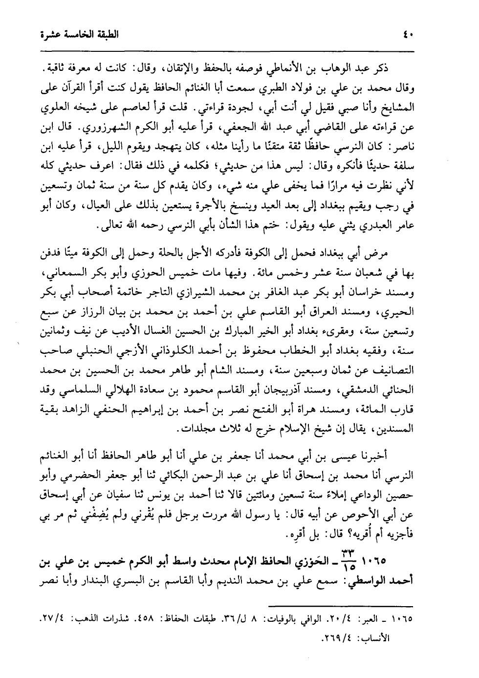 1065- 33/15- الحوزي الحافظ الإمام محدث واسط أبو الكرم خميس بن علي بن أحمد الواسطي: سمع علي بن محمد النديم وأبا القاسم بن البسي البندار وأبا نصر