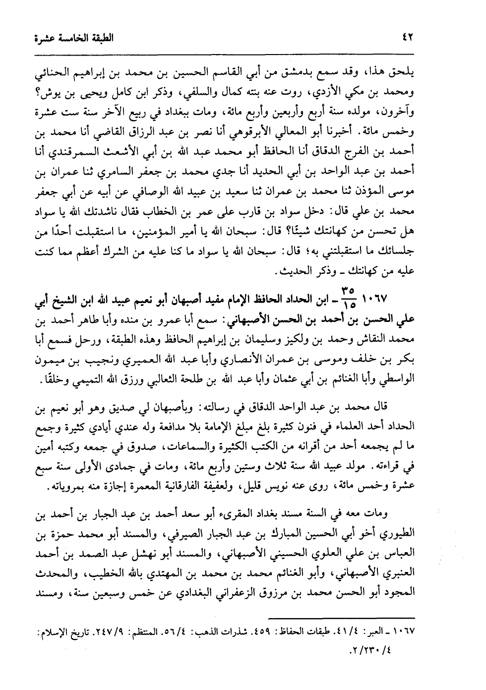 1067- 35/15- بن الحداد الحافظ الإمام مفيد أصبهان, أبو نعيم عبيد الله بن الشيخ أبي علي الحسن بن أحمد بن الحسن الأصبهاني: سمع أبا عمرو بن منده وأبا طاهر أحمد بن محمد النقاش وحمد بن ولكيز وسليمان بن إبراهيم الحافظ وهذه الطبقة، ورحل فسمع أبا بكر بن خلف وموسى بن عمران الأنصاري وأبا عبد الله العميري ونجيب بن ميمون الواسطي وأبا الغنائم بن أبي عثمان وأبا عبد الله بن طلحة الثعالبي ورزق الله التميمي وخلقًا.