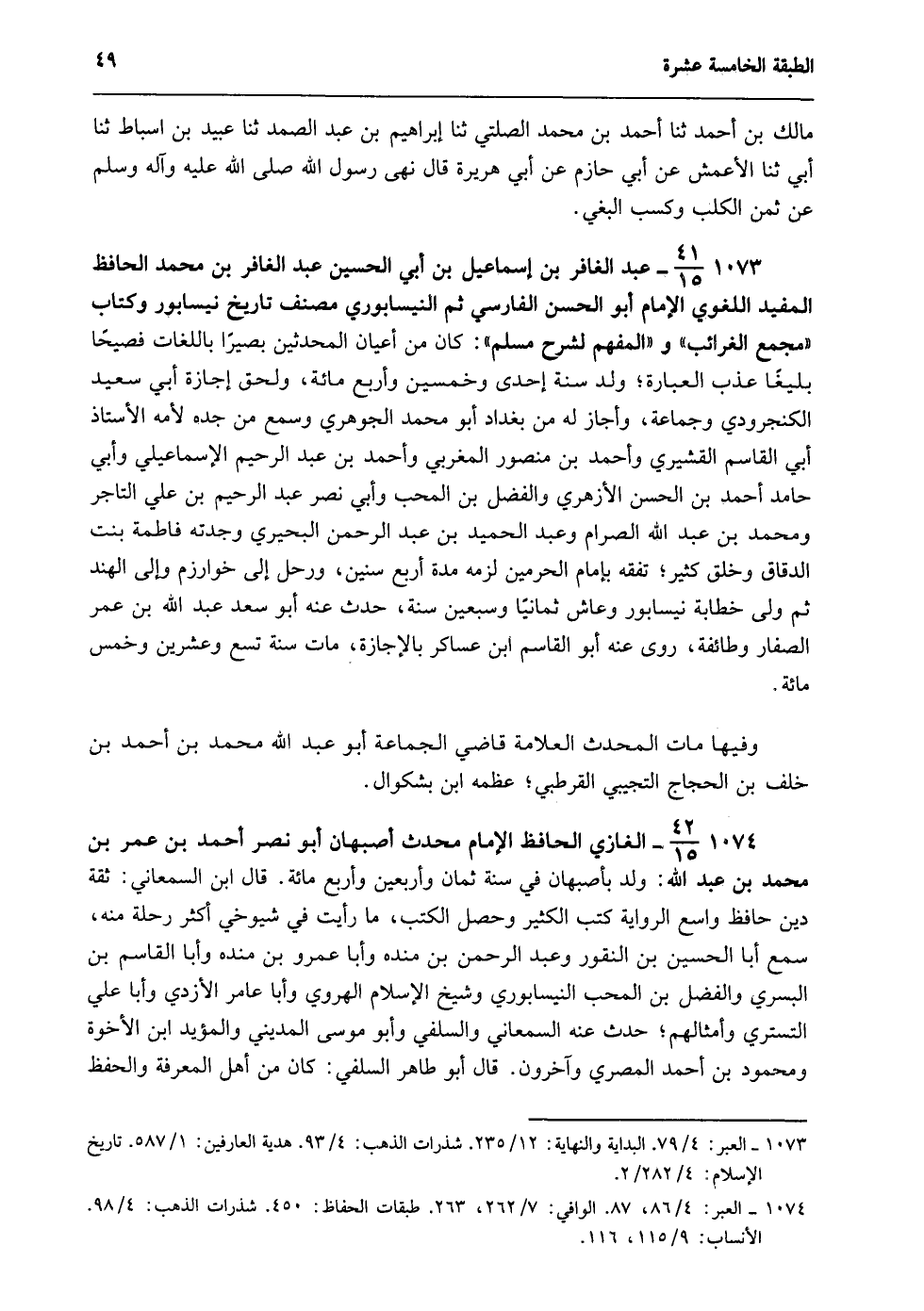 1073- 41/15- عبد الغافر بن إسماعيل بن أبي الحسين عبد الغافر بن محمد الحافظ المفيد اللغوي, الإمام أبو الحسن الفارسي ثم النيسابوري, مصنف تاريخ نيسابور وكتاب "مجمع الغرائب" و"المفهم لشرح مسلم": كان من أعيان المحدثين بصيرًا باللغات فصيحًا بليغًا عذب العبارة؛ ولد سنة إحدى وخمسين وأربعمائة، ولحق إجازة أبي سعيد الكنجرودي وجماعة، وأجاز له من بغداد أبو محمد الجوهري وسمع من جده لأمه الأستاذ أبي القاسم القشيري وأحمد بن منصور المغربي وأحمد بن عبد الرحيم الإسماعيلي وأبي حامد أحمد بن الحسن الأزهري والفضل بن المحب وأبي نصر عبد الرحيم بن علي التاجر ومحمد بن عبد الله الصرام وعبد الحميد بن عبد الرحمن البحيري وجدته فاطمة بنت الدقاق وخلق كثير؛ تفقه بإمام الحرمين لزمه مدة أربع سنين، ورحل إلى خوارزم وإلى الهند ثم ولي خطابة نيسابور وعاش ثمانيًا وسبعين سنة، حدث عنه أبو سعد عبد الله بن عمر الصفار وطائفة، روى عنه أبو القاسم بن عساكر بالإجازة، مات سنة تسع وعشرين وخمسمائة.