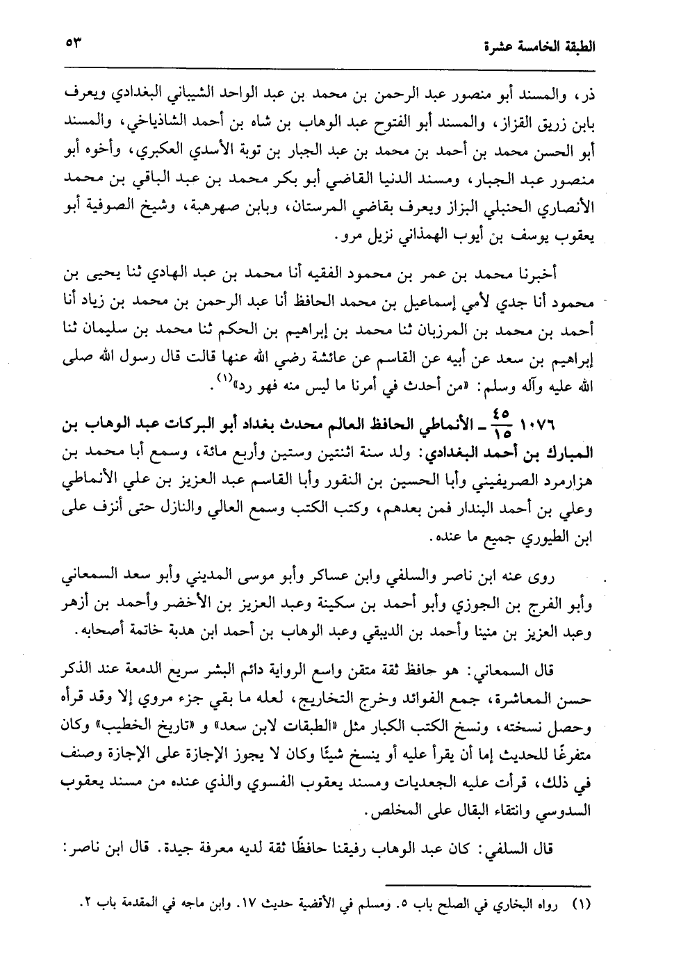 1076- 45/15- الأنماطي الحافظ العالم محدث بغداد أبو البركات عبد الوهاب بن المبارك بن أحمد البغدادي: ولد سنة اثنتين وستين وأربعمائة، وسمع أبا محمد بن هزارمرد الصريفيني وأبا الحسين بن النقور وأبا القاسم عبد العزيز بن علي الأنماطي وعلي بن أحمد البندار فمن بعدهم، وكتب الكتب وسمع العالي والنازل حتى أنزف على بن الطيوري جميع ما عنده.