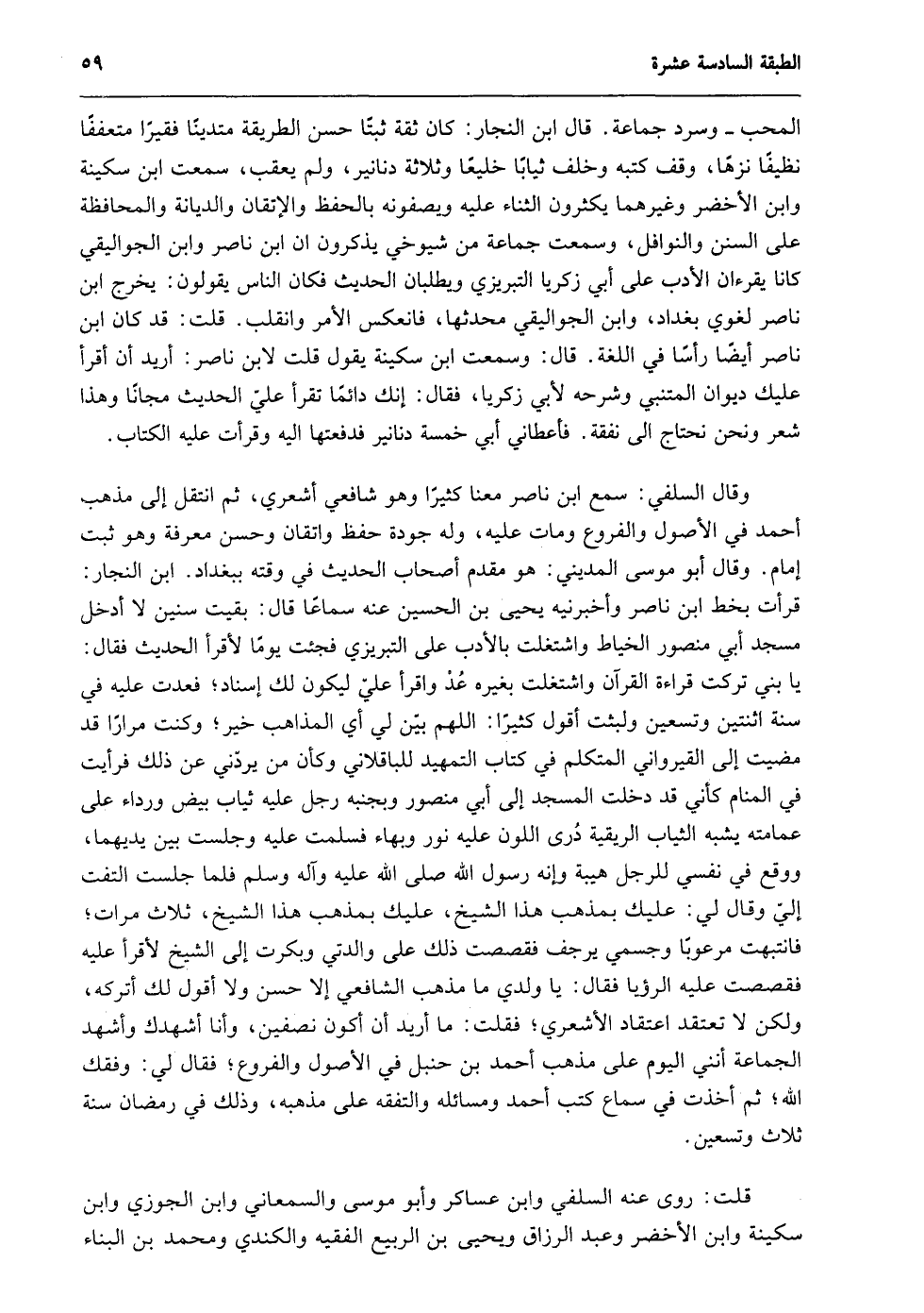 المحب, وسرد جماعة. قال بن النجار: كان ثقة ثبتًا حسن الطريقة متدينًا فقيرًا متعففًا نظيفًا نزهًا، وقف كتبه وخلف ثيابًا خليعة وثلاثة دنانير، ولم يعقب، سمعت بن سكينة وابن الأخضر وغيرهما يكثرون الثناء عليه ويصفونه بالحفظ والإتقان والديانة والمحافظة على السنن والنوافل، وسمعت جماعة من شيوخي يذكرون أن بن ناصر وابن الجواليقي كانا يقرآن الأدب على أبي زكريا التبريزي ويطلبان الحديث فكان الناس يقولون: يخرج بن ناصر لغوي بغداد، وابن الجواليقي محدثها، فانعكس الأمر وانقلب. قلت: قد كان بن ناصر أيضًا رأسًا في اللغة. قال: وسمعت بن سكينة يقول: قلت لابن ناصر: أريد أن أقرأ عليك ديوان المتنبي وشرحه لأبي زكريا، فقال: إنك دائمًا تقرأ علي الحديث مجانًا وهذا شعر ونحن نحتاج إلى نفقة. فأعطاني أبي خمسة دنانير فدفعتها إليه وقرأت عليه الكتاب.
