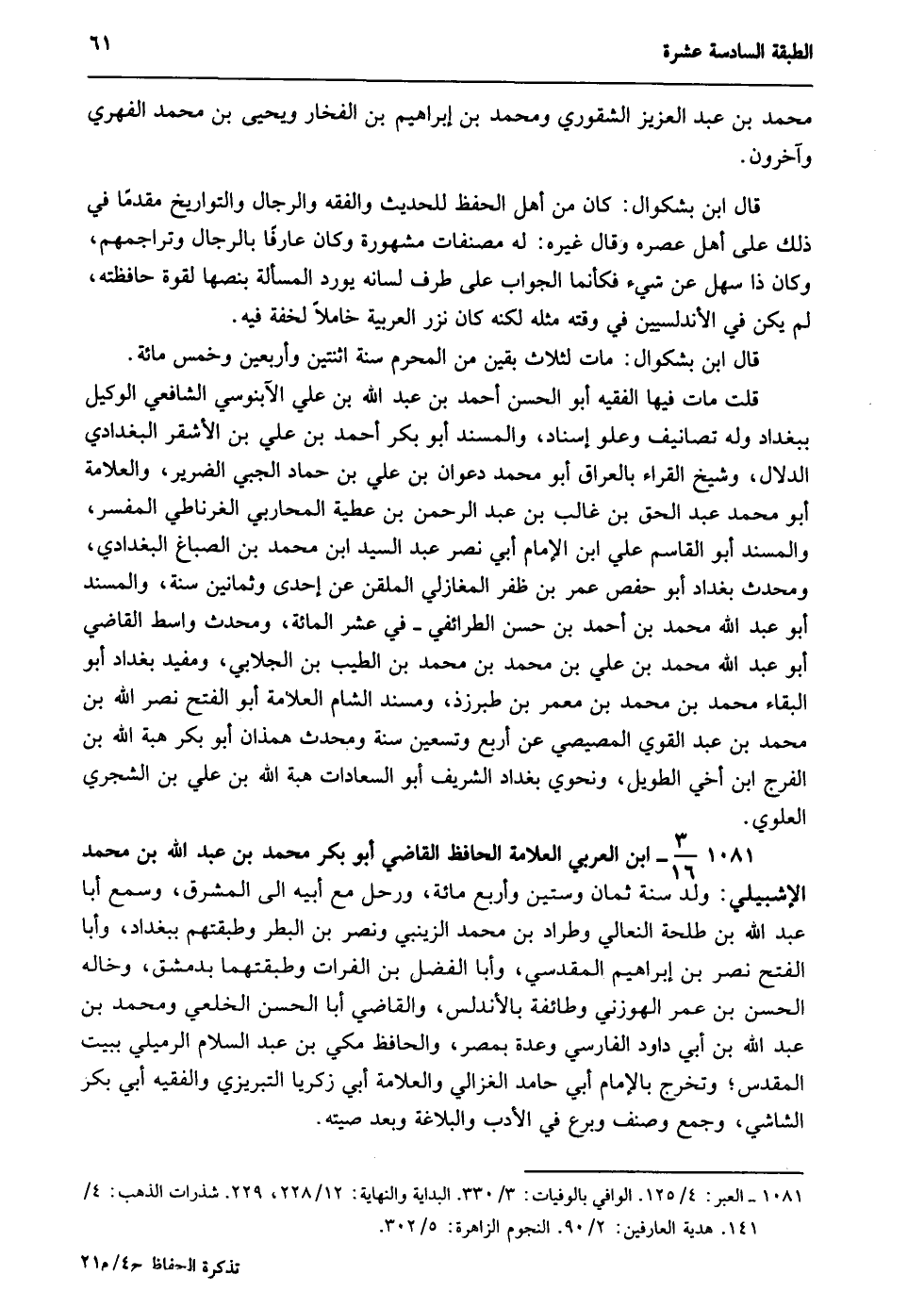 1081- 3/16- ابن العربي العلامة الحافظ القاضي أبو بكر محمد بن عبد الله بن محمد الإشبيلي: ولد سنة ثمان وستين وأربعمائة، ورحل مع أبيه إلى المشرق، وسمع أبا عبد الله بن طلحة النعالي وطراد بن محمد الزينبي ونصر بن البطر وطبقتهم ببغداد، وأبا الفتح نصر بن إبراهيم المقدسي، وأبا الفضل بن الفرات وطبقتهما بدمشق، وخاله الحسن بن عمر الهوزني وطائفة بالأندلس، والقاضي أبا الحسن الخلعي ومحمد بن عبد الله بن أبي داود الفارسي وعدة بمصر، والحافظ مكي بن عبد السلام الرميلي ببيت المقدس؛ وتخرج بالإمام أبي حامد الغزالي والعلامة أبي زكريا التبريزي والفقيه أبي بكر الشاشي، وجمع وصنف وبرع في الأدب والبلاغة وبعد صيته.