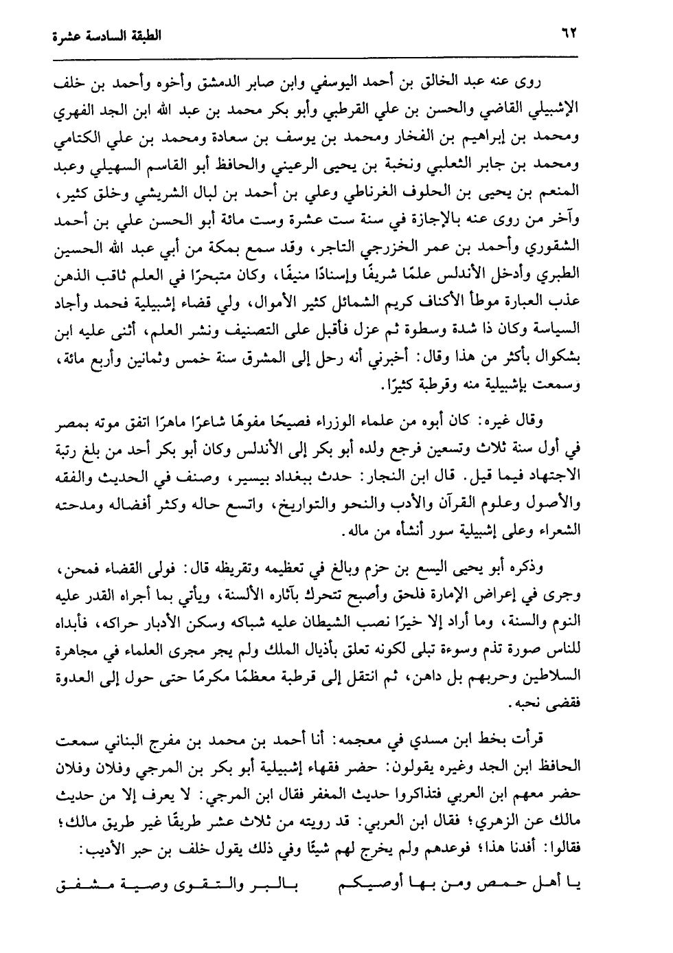 وذكره أبو يحيى أليسع بن حزم وبالغ في تعظيمه وتقريظه قال: فولي القضاء فمحن، وجرى في إعراض الإمارة فلحق وأصبح تتحرك بآثاره الألسنة، ويأتي بما أجراه القدر عليه النوم والسنة، وما أراد إلا خيرًا نصب الشيطان عليه شباكه وسكن الإدبار حراكه، فأبداه للناس صورة تذم وسوءة تبلى لكونه تعلق بأذيال الملك ولم يجر مجرى العلماء في مجاهرة السلاطين وحربهم بل داهن، ثم انتقل إلى قرطبة معظمًا مكرمًا حتى حول إلى العدوة فقضى نحبه.