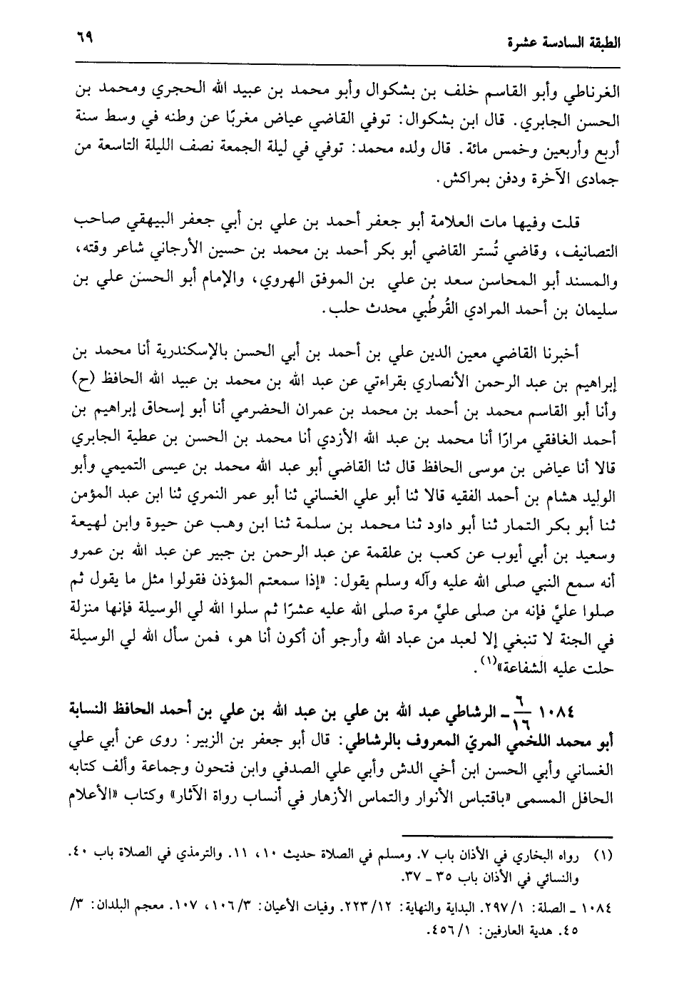 1084- 6/16- الرشاطي عبد الله بن علي بن عبد الله بن علي بن أحمد الحافظ النسابة أبو محمد اللخمي المري المعروف بالرشاطي: قال أبو جعفر بن الزبير: روى عن أبي علي الغساني وأبي الحسن ابن أخي الدش وأبي علي الصدفي وابن فتحون وجماعة وألف كتابه الحافل المسمى بـ"اقتباس الأنوار والتماس الأزهار في أنساب رواة الآثار" وكتاب "الإعلام