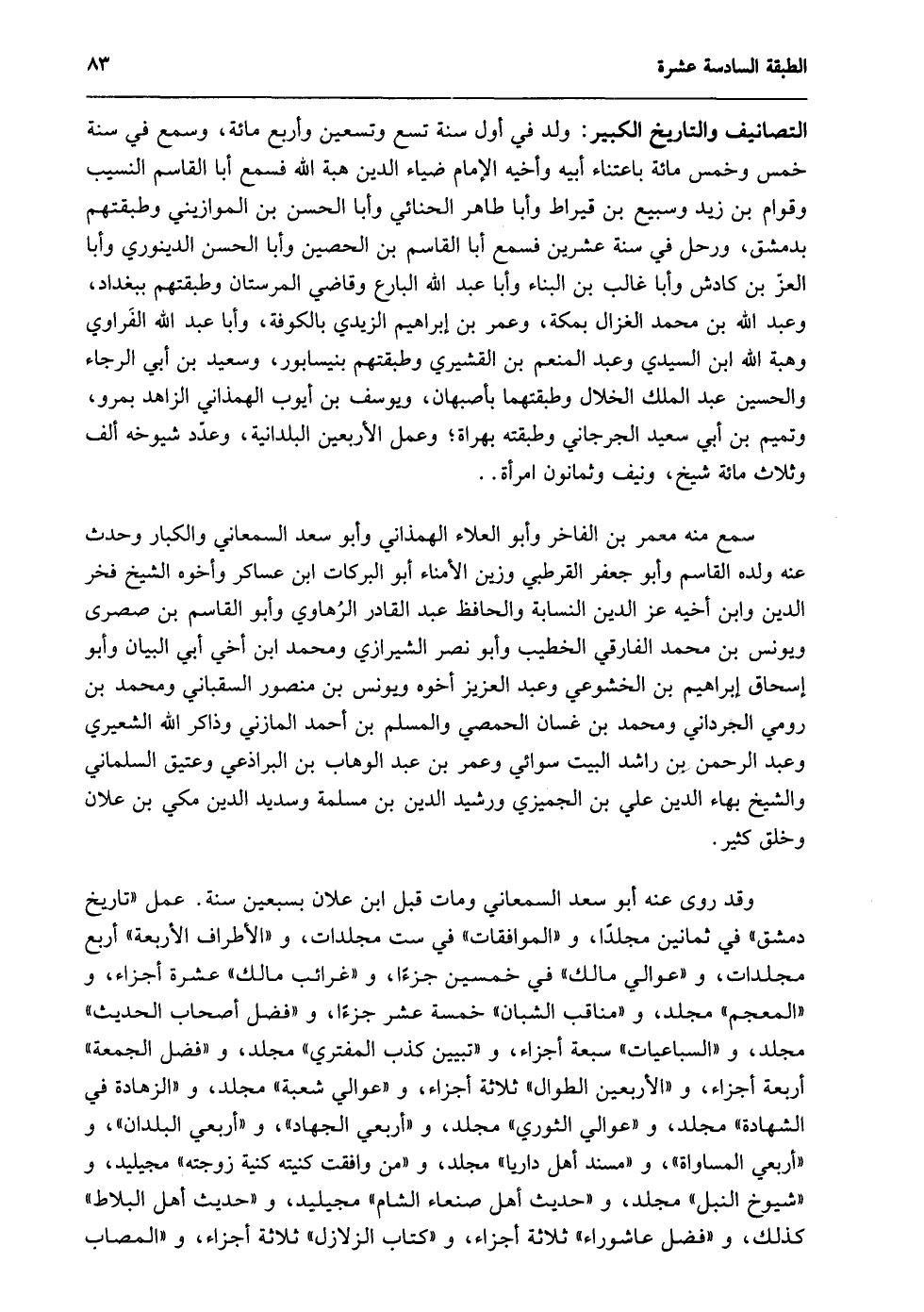 التصانيف والتاريخ الكبير: ولد في أول سنة تسع وتسعين وأربعمائة، وسمع في سنة خمس وخمسمائة باعتناء أبيه وأخيه الإمام ضياء الدين هبة الله؛ فسمع أبا القاسم النسيب وقوام بن زيد وسبيع بن قيراط وأبا طاهر الحنائي وأبا الحسن بن الموازيني وطبقتهم بدمشق، ورحل في سنة عشرين فسمع أبا القاسم بن الحصين وأبا الحسن الدينوري وأبا العز بن كادش وأبا غالب بن البناء وأبا عبد الله البارع وقاضي المرستان وطبقتهم ببغداد، وعبد الله بن محمد الغزال بمكة، وعمر بن إبراهيم الزيدي بالكوفة، وأبا عبد الله الفراوي وهبة الله ابن السيدي وعبد المنعم بن القشيري وطبقتهم بنيسابور، وسعيد بن أبي الرجاء والحسين عبد الملك الخلال وطبقتهما بأصبهان، ويوسف بن أيوب الهمذاني الزاهد بمرو، وتميم بن أبي سعيد الجرجاني وطبقته بهراة؛ وعمل الأربعين البلدانية، وعدد شيوخه ألف وثلاثمائة شيخ، ونيف وثمانون امرأة.
