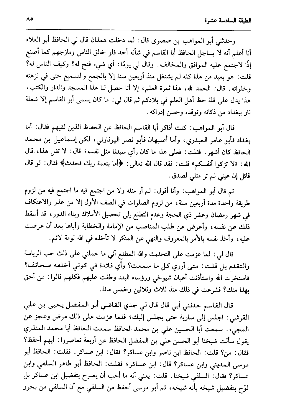 قال أبو المواهب: كنت أذاكر أبا القاسم الحافظ عن الحفاظ الذين لقيهم فقال: أما بغداد فأبو عامر العبدري، وأما أصبهان فأبو نصر اليونارتي، لكن إسماعيل بن محمد الحافظ كان أشهر. فقلت: فعلى هذا ما كان رأى سيدنا مثل نفسه؛ قال: لا تقل هذا، قال الله: {فَلا تُزَكُّوا أَنْفُسَكُمْ} قلت: فقد قال الله تعالى: {أَمَّا بنِعْمَةِ رَبِّكَ فَحَدِّثْ} فقال: لو قال قائل: إن عيني لم تر مثلي لصدق.