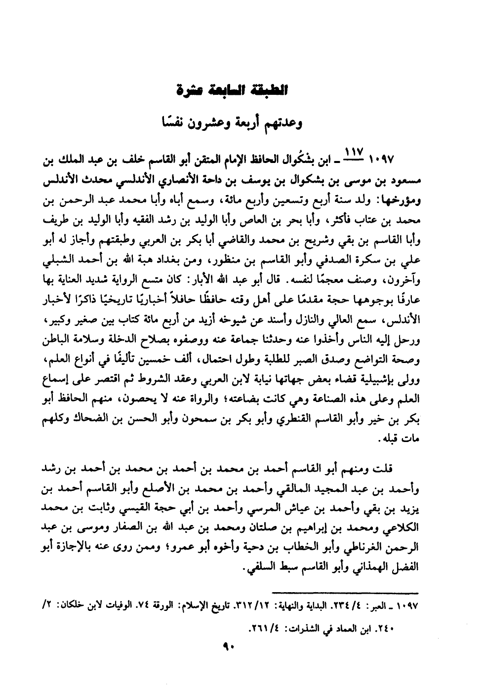 1097- 117/17- ابن بشْكُوال الحافظ الإمام المتقن, أبو القاسم خلف بن عبد الملك بن مسعود بن موسى بن بشكوال بن يوسف بن داحة الأنصاري الأندلسي محدث الأندلس ومؤرخها: ولد سنة أربع وتسعين وأربعمائة، وسمع أباه وأبا محمد عبد الرحمن بن محمد بن عتاب فأكثر، وأبا بحر بن العاص وأبا الوليد بن رشد الفقيه وأبا الوليد بن طريف وأبا القاسم بن بقي وشريح بن محمد والقاضي أبا بكر بن العربي وطبقتهم, وأجاز له أبو علي بن سكرة الصدفي وأبو القاسم بن منظور، ومن بغداد هبة الله بن أحمد الشبلي وآخرون، وصنف معجمًا لنفسه. قال أبو عبد الله الأبار: كان متسع الرواية شديد العناية بها عارفًا بوجوهها حجة مقدمًا على أهل وقته حافظًا حافلًا أخباريًّا تاريخيًّا ذاكرًا لأخبار الأندلس، سمع العالي والنازل وأسند عن شيوخه أزيد من أربعمائة كتاب بين صغير وكبير، ورحل إليه الناس وأخذوا عنه وحدثنا جماعة عنه ووصفوه بصلاح الدخلة وسلامة الباطن وصحة التواضع وصدق الصبر للطلبة وطول احتمال، ألف خمسين تأليفًا في أنواع العلم، وولي بإشبيلية قضاء بعض جهاتها نيابة لابن العربي وعقد الشروط ثم اقتصر على إسماع العلم وعلى هذه الصناعة وهي كانت بضاعته؛ والرواة عنه لا يحصون، منهم الحافظ أبو بكر بن خير وأبو القاسم القنطري وأبو بكر بن سمحون وأبو الحسن بن الضحاك وكلهم مات قبله.