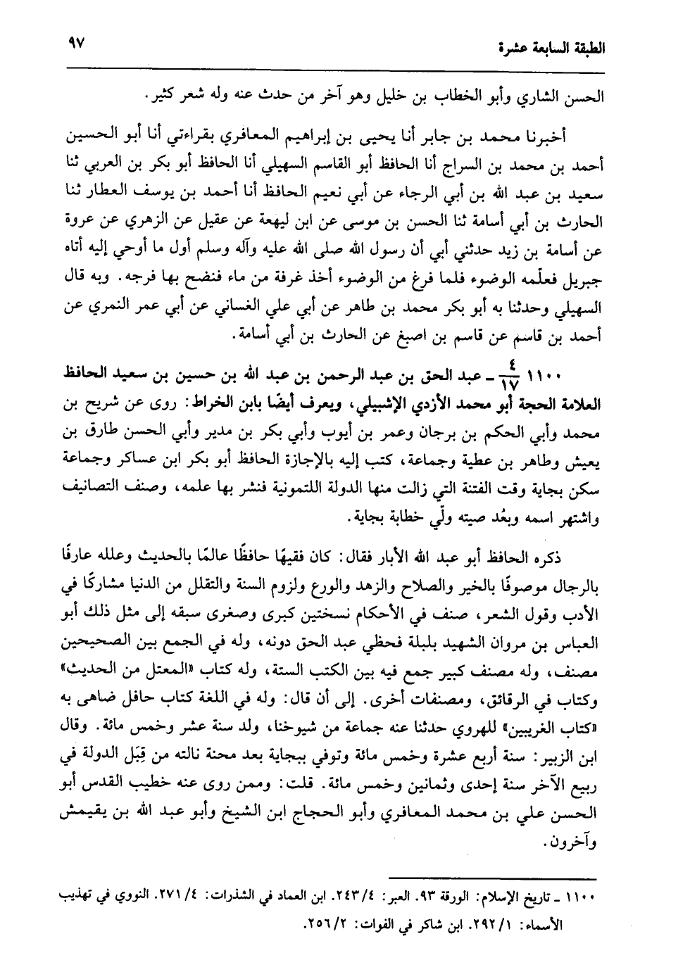 1100- 4/17- عبد الحق بن عبد الرحمن بن عبد الله بن حسين بن سعيد الحافظ العلامة الحجة أبو محمد الأزدي الإشبيلي، ويعرف أيضًا بابن الخراط: روى عن شريح بن محمد وأبي الحكم بن برجان وعمر بن أيوب وأبي بكر بن مدير وأبي الحسن طارق بن يعيش وطاهر بن عطية وجماعة، كتب إليه بالإجازة الحافظ أبو بكر ابن عساكر وجماعة سكن بجاية وقت الفتنة التي زالت منها الدولة اللمتونية فنشر بها علمه، وصنف التصانيف واشتهر اسمه وبعُد صيته ولي خطابة بجاية.