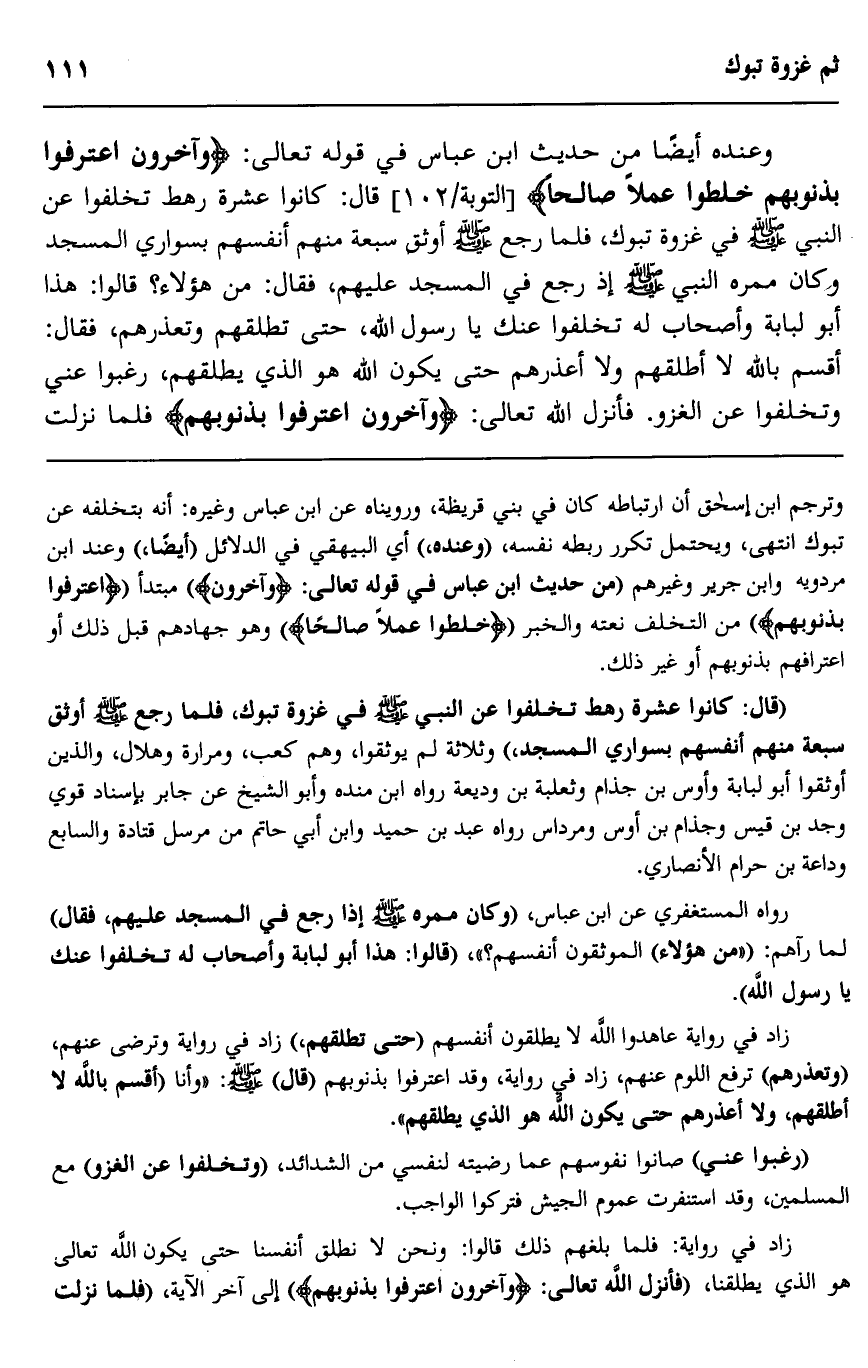 وعنده أيضا من حديث ابن عباس في قوله تعالى: {وَآخَرُونَ اعْتَرَفُوا بِذُنُوبِهِمْ خَلَطُوا عَمَلًا صَالِحًا} [التوبة/ 102] قال: كانوا عشرة رهط تخلفوا عن النبي صلى الله عليه وسلم في غزوة تبوك، فلما رجع صلى الله عليه وسلم أوثق سبعة منهم أنفسهم بسواري المسجد وكان ممره النبي صلى الله عليه وسلم إذ رجع في المسجد عليهم، فقال: من هؤلاء؟ قالوا: هذا أبو لبابة وأصحاب له تخلفوا عنك يا رسول الله، حتى تطلقهم وتعذرهم، فقال: أقسم بالله لا أطلقهم ولا أعذرهم حتى يكون الله هو الذي يطلقهم، رغبوا عني وتخلفوا عن الغزو، فأنزل الله تعالى: {وَآخَرُونَ اعْتَرَفُوا بِذُنُوبِهِمْ} فلما نزلت