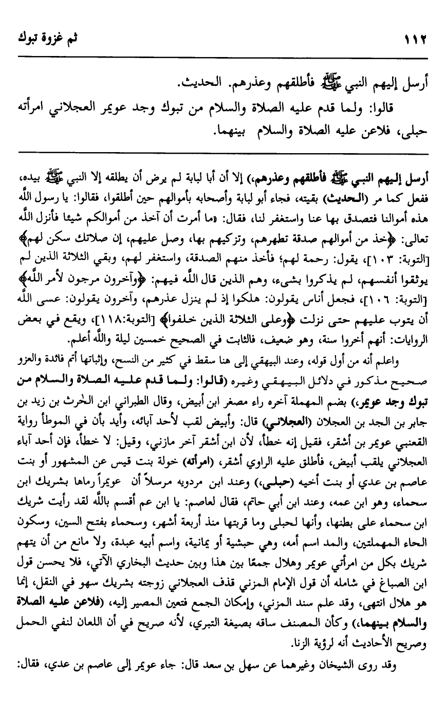واعلم أنه من أول قوله، وعند البيهقي إلى هنا سقط في كثير من النسخ، وإثباتها أتم فائدة والعزو صحيح مذكور في دلائل البيهقي إلى هنا سقط في كثير من النسخ، وإثباتها أتم فائدة والغزو صحيح مذكور في دلائل البيهقي وغيره "قالوا: ولما قدم عليه الصلاة والسلام من تبوك وجد عويمر" بضم المهملة آخره راء مصغر ابن أبيض، وقال الطبراني ابن الحارث بن زيد بن جابر بن الجد بن العجلان "العجلاني" قال: وأبيض لقب لأحد آبائه، وأيد بأن في الموطأ رواية القعنبي عويمر بن أشقر، فقيل إنه خطأ لأن ابن أشقر آخر مازني، وقيل: لا خطأ، فإن أحد آباء العجلاني يلقب أبيض، فأطلق عليه الراوي أشقر، "امرأته" خولة بنت قيس عن المشهور أو بنت عاصم بن عدي أو بنت أخيه "حبلى" وعند ابن مردويه مرسلا أن عويمر رماها بشريك بن سحماء، وهو ابن عمه، وعند ابن أبي حاتم فقال لعاصم: يابن عم أقسم بالله لقد رأيت شريك بن سحماء على بطنها، وأنها لحبلى وما قربتها منذ أربعة أشهر، وسحماء بفتح السين، وسكون الحاء المهملتين، والمد اسم أمه، وهي حبشية أو يمانية، واسم أبيه عبده، ولا مانع من أن يتهم شريك بكل من امرأتي عويمر وهلال جمعا بين هذا وبين حديث البخاري الآتي، فلا يحسن قول ابن الصباغ في شامله أن قول الإمام المزني قذف العجلاني زوجته بشريك سهو في النقل، إنما هو هلال انتهى، وقد علم سند المزني، وإمكان الجمع فتعين المصير إليه، "فلاعن عليه الصلاة والسلام بينهما"، وكأن المصنف ساقه بصيغة التبري؛ لأنه صريح في أن اللعان لنفي الحمل وصريح الأحاديث أنه لرؤية الزنا.
