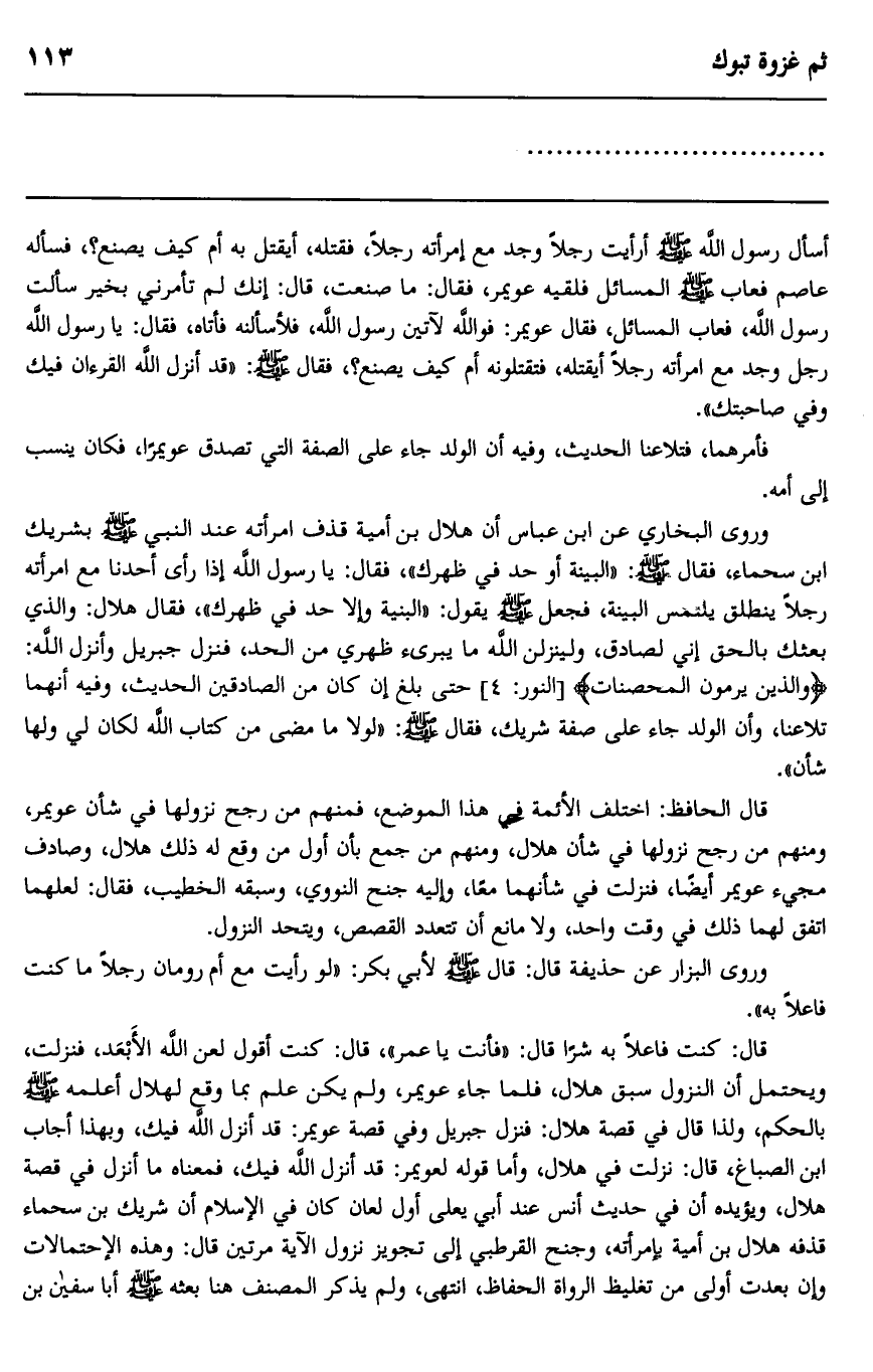 قال: كنت فاعلا به شرا قال: "فأنت يا عمر" قال: كنت أقول لعن الله الأبعد، فنزلت، ويحتمل أن النزول سبق هلال، فلما جاء عويمر، ولم يكن علم بما وقع لهلال أعلمه صلى الله عليه وسلم بالحكم، ولذا قال في قصة هلال: فنزل جبريل وفي قصة عويمر: "قد أنزل الله فيك"، وبهذا أجاب ابن الصباغ، قال: نزلت في هلال، وأما قوله لعويمر: "قد أنزل الله فيك"، فمعناه ما أنزل في قصة هلال، ويؤيده أن في حديث أنس عند أبي يعلى أول لعان كان في الإسلام أن شريك بن سحماء قذفه هلال بن أمية بإمرأته، وجنح القرطبي إلى تجويز نزول الآية مرتين قال: وهذه الاحتمالات وإن بعدت أولى من تغليظ الرواة الحفاظ، انتهى، ولم يذكر المصنف هنا بعثه صلى الله عليه والسلام أبا سفيان بن حرب والمغيرة بن شعبة لهدم اللات بالطائف لما أتاه وفدهم مسلمين، فذهبا في بضعة عشر رجلا، فهدموها حتى سووها بالأرض، ثم خرب المغيرة أساسها، وأخذوا حليتها وكسوتها وما فيها من طيب وذهب وفضة، وأقبلوا حتى دخلوا عليه صلى الله عليه وسلم، فحمد الله على نصره واعزاز دينه، وقسم المال من يومه اكتفاء بأنه أشار إلى ذلك في الوفود والله أعلم.