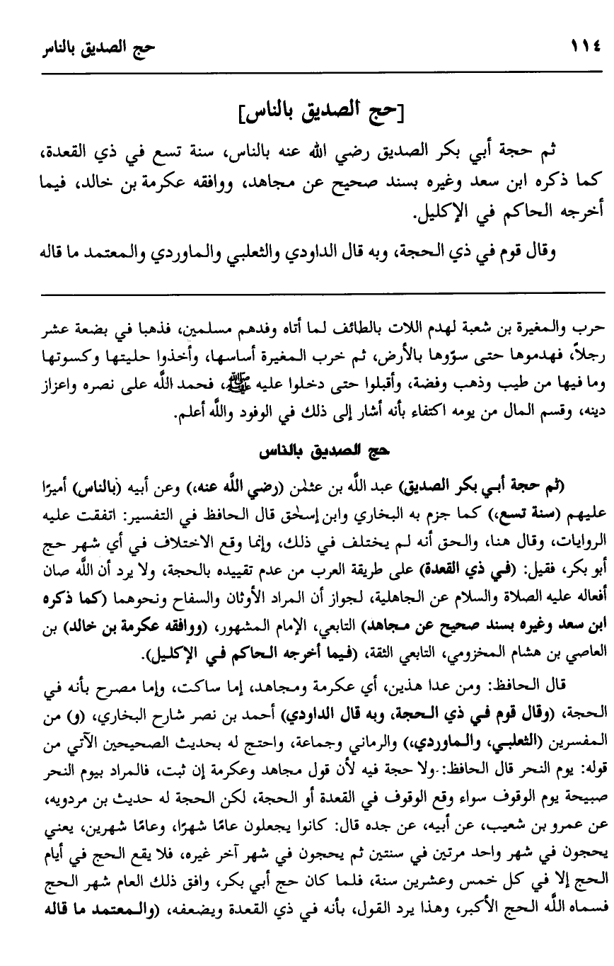 ثم حجة أبي بكر الصديق رضي الله عنه بالناس، سنة تسع في ذي القعدة، كما ذكره ابن سعد وغيره بسند صحيح عن مجاهد، ووافقه عكرمة بن خالد، فيما أخرجه الحاكم في الإكليل.