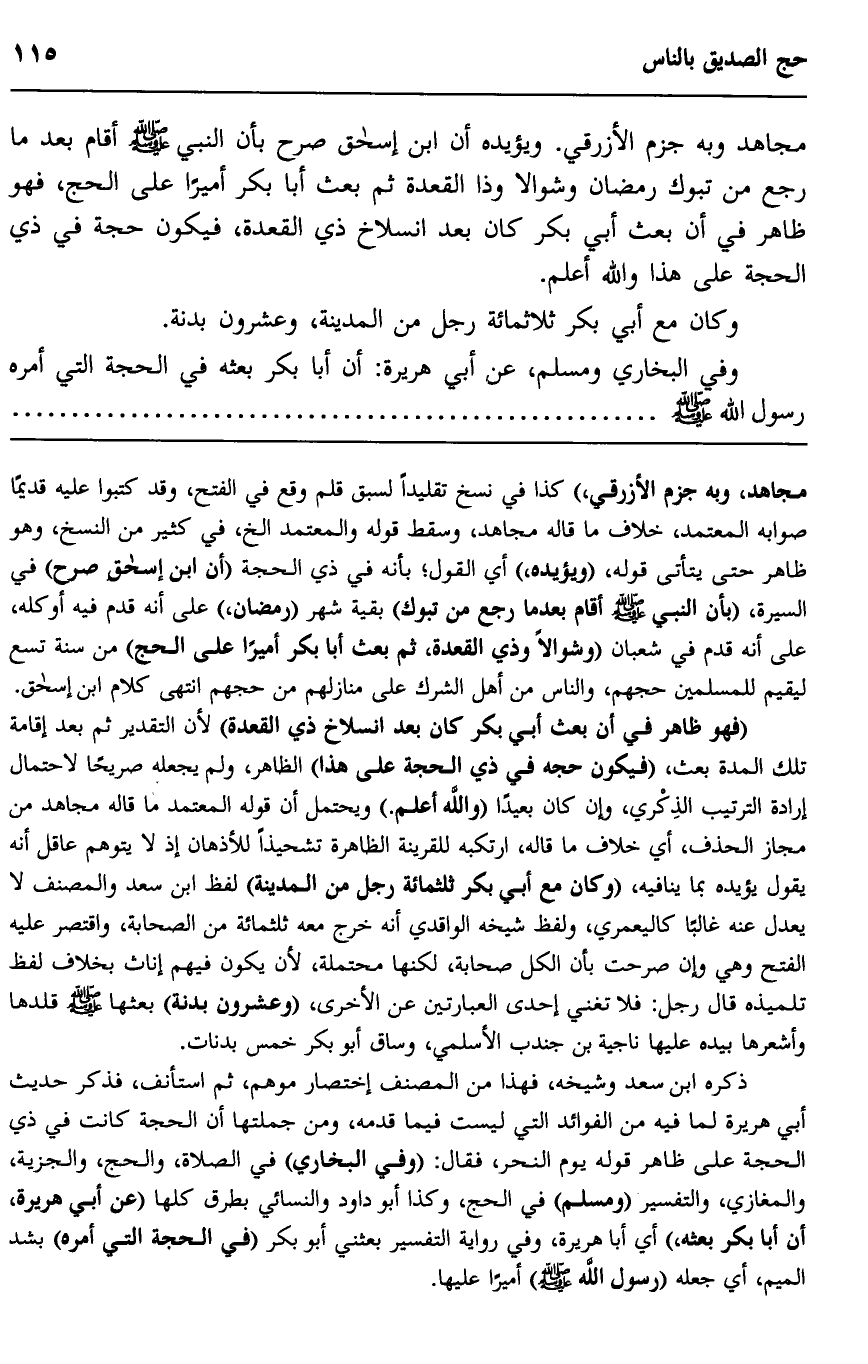 "فهو ظاهر في أن بعث أبي بكر كان بعد انسلاخ ذي القعدة" لأن التقدير ثم بعد إقامة تلك المدة بعث، "فيكون حجه في ذي الحجة على هذا" الظاهر، ولم يجعله صريحا لاحتمال إرادة الترتيب الذكري، وإن كان بعيدا "والله أعلم" ويحتمل أن قوله المعتمد ما قاله مجاهد من مجاز الحذف، أي خلاف ما قاله، ارتكبه للقرينة الظاهرة تشحيذا للأذهان إذ لا يتوهم عاقل أنه يقول يؤيده بما ينافيه، "وكان مع أبي بكر ثلاثمائة رجل من المدينة" لفظ ابن سعد والمصنف لا يعدل عنه غالبا كاليعمري، ولفظ شيخه الواقدي أنه خرج معه ثلاثمائة من الصحابة، واقتصر عليه الفتح وي وإن صرحت بأن الكل صحابة، لكنها محتملة؛ لأن يكون فيهم إناث بخلاف لفظ تلميذه قال رجل: فلا تغني إحدى العبارتين عن الأخرى، "وعشرون بدنة" بعثها صلى الله عليه وسلم قلدها وأشعرها بيده عليها ناجية بن جندب الأسلمي، وساق أبو بكر خمس بدنات.