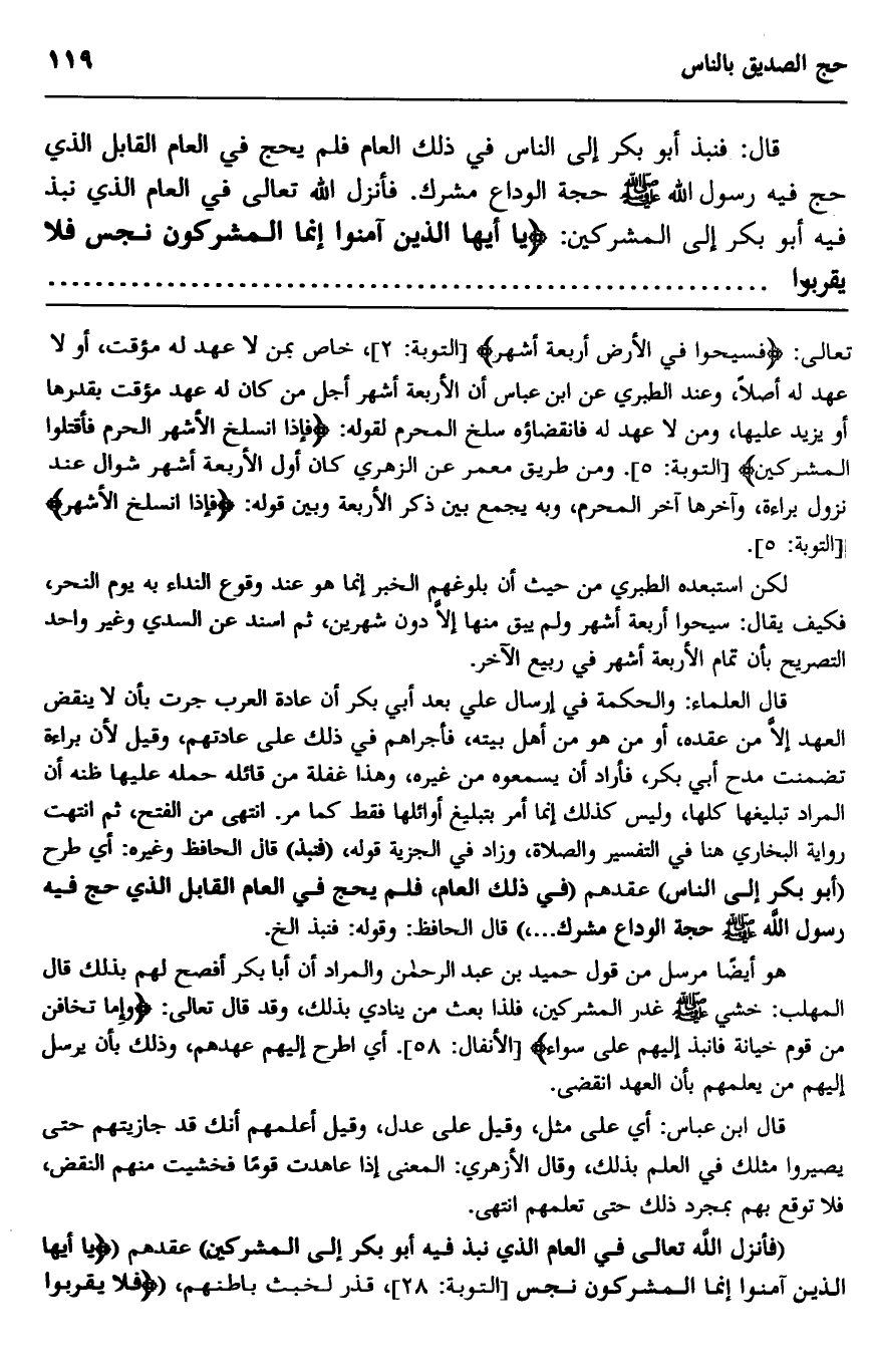 قال: فنبذ أبو بكر إلى الناس في ذلك العام فلم يحج في العام القابل الذي حج فيه فيه رسول الله صلى الله عليه وسلم حجة الوداع مشرك: فأنزل الله تعالى في العام الذي نبذ فيه أبو بكر إلى المشركين: {يَا أَيُّهَا الَّذِينَ آمَنُوا إِنَّمَا الْمُشْرِكُونَ نَجَسٌ فَلَا يَقْرَبُوا}