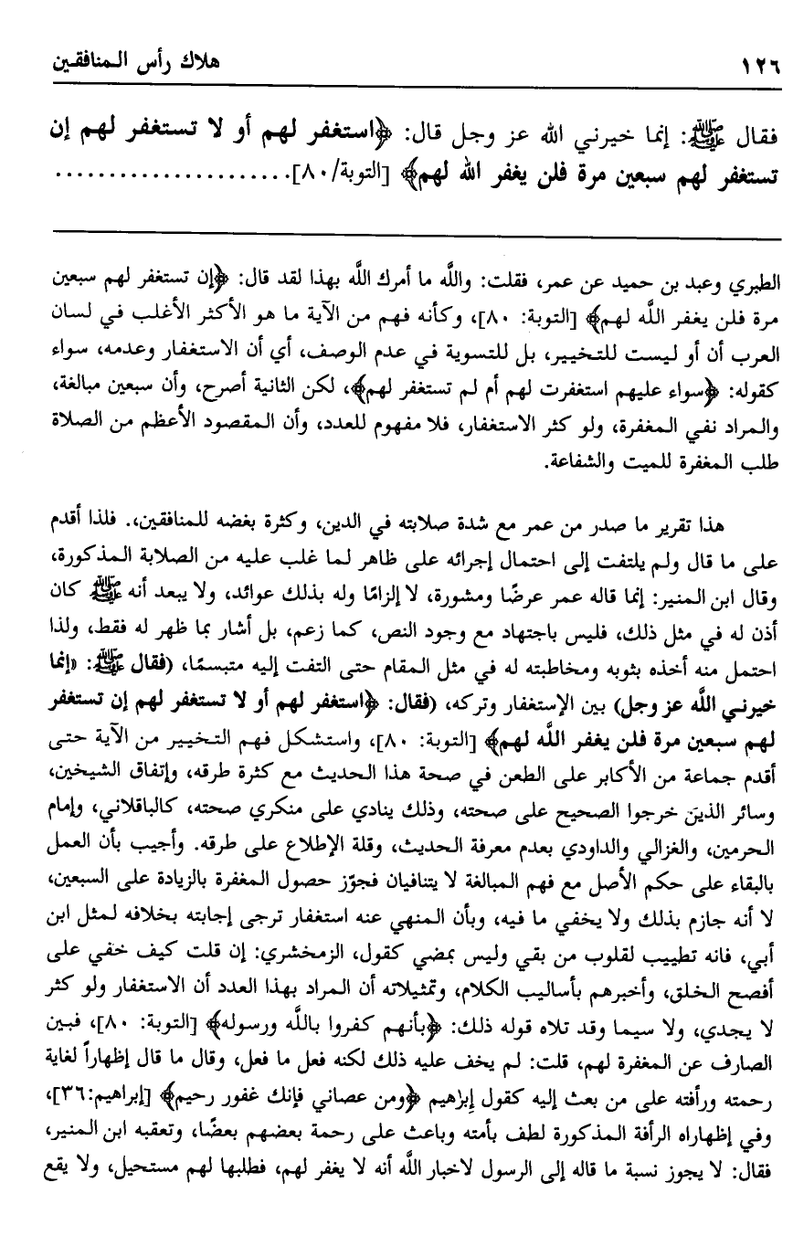 الطبري وعبد بن حميد عن عمر، فقلت: والله ما أمرك الله بهذا لقد قال: {اسْتَغْفِرْ لَهُمْ أَوْ لَا تَسْتَغْفِرْ لَهُمْ {إِنْ تَسْتَغْفِرْ لَهُمْ سَبْعِينَ مَرَّةً فَلَنْ يَغْفِرَ اللَّهُ لَهُمْ} [التوبة: 80] ، وكأنه فهم من الآية ما هو الأكثر الأغلب في لسان العرب أن أو ليست للتخيير، بل للتسوية في عدم الوصف، أي أن الاستغفار وعدمه، سواء كقوله: {سَوَاءٌ عَلَيْهِمْ أَسْتَغْفَرْتَ لَهُمْ أَمْ لَمْ تَسْتَغْفِرْ لَهُمْ} ، لكن الثانية أصرح، وأن سبعين مبالغة، والمراد نفي المغفرة، ولو كثر لاستغفار فلا مفهوم للعدد، وأن المقصود الأعظم من الصلاة طلب المغفرة للميت والشفاعة.