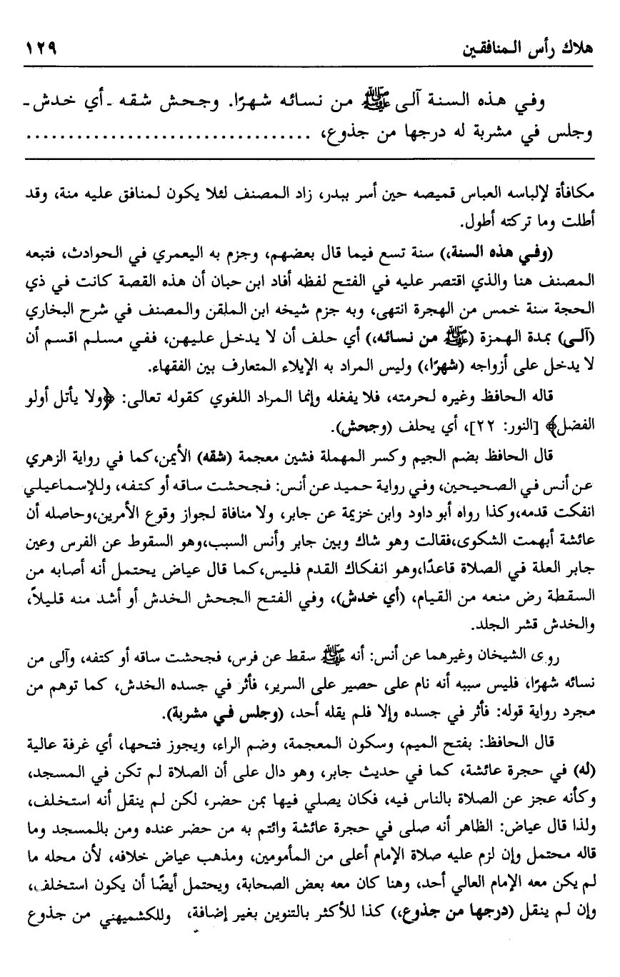 وفي هذه السنة آلى صلى الله عليه وسلم من نسائه شهرا. وجحش شقه -أي خدش- وجلس في مشربة له درجها من جذوع،
