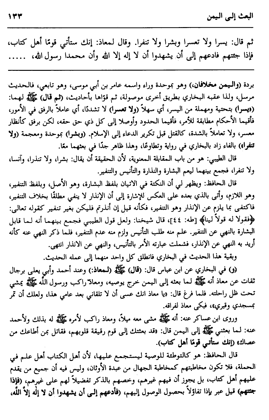 ثم قال: "يسرا ولا تعسرا وبشرا ولا تنفرا". وقال لمعاذ: "إنك ستأتي قوما أهل كتاب، فإذا جئتهم، فادعهم إلى أن يشهدوا أن لا إله إلا الله وأن محمد رسول الله