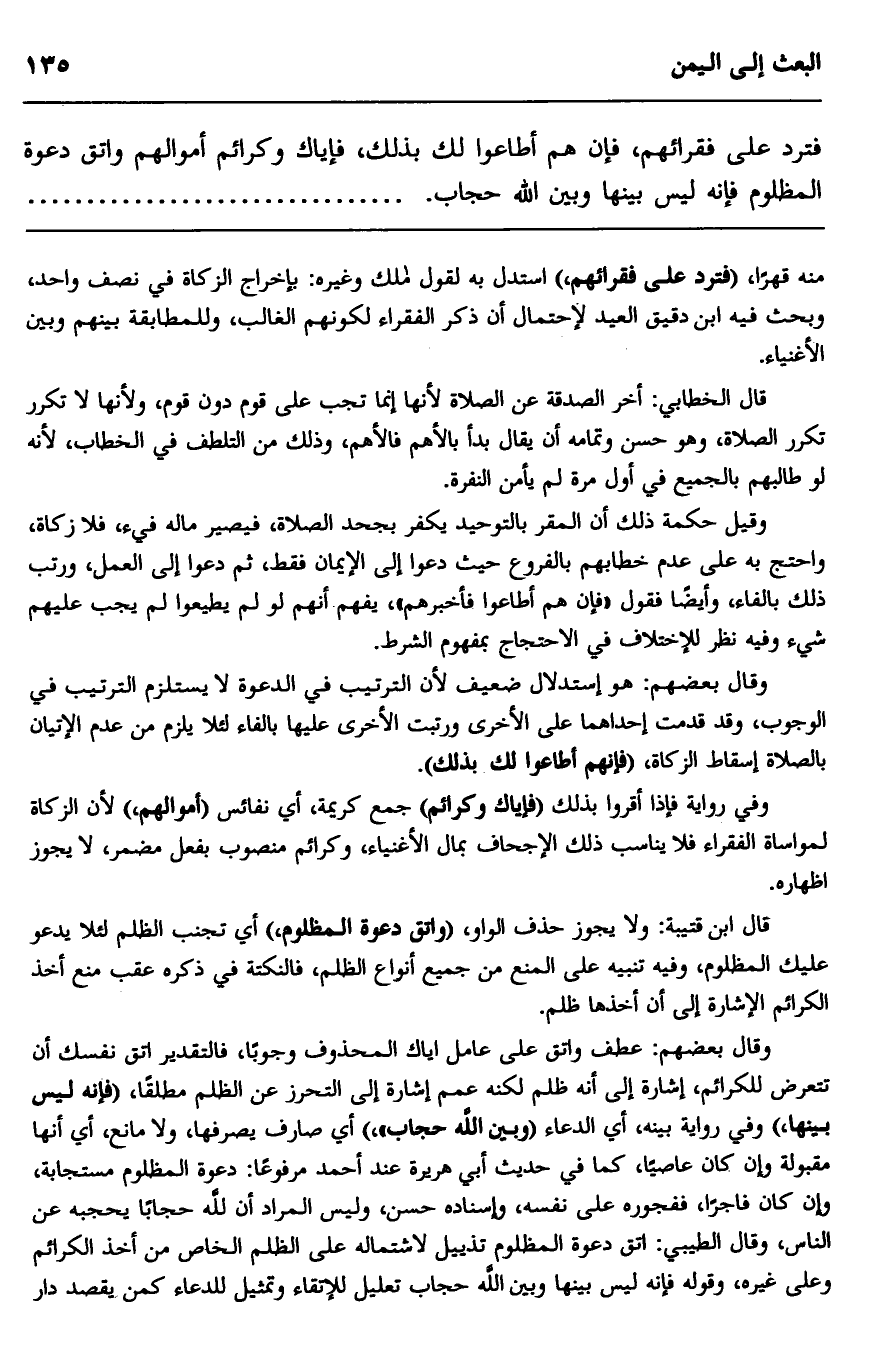 فترد على فقرائهم؛ فإن هم أطاعوا لك بذلك، فإنك وكرائم أموالهم واتق دعوة المظلوم فإنه ليس بينها وبين الله حجاب".