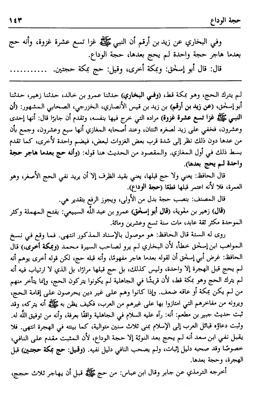 وفي البخاري عن زيد بن أرقم أن النبي صلى الله عليه وسلم غزا تسع عشرة غزوة، وأنه حج بعدما هاجر حجة واحدة لم يحج بعدها، حجة الوداع.