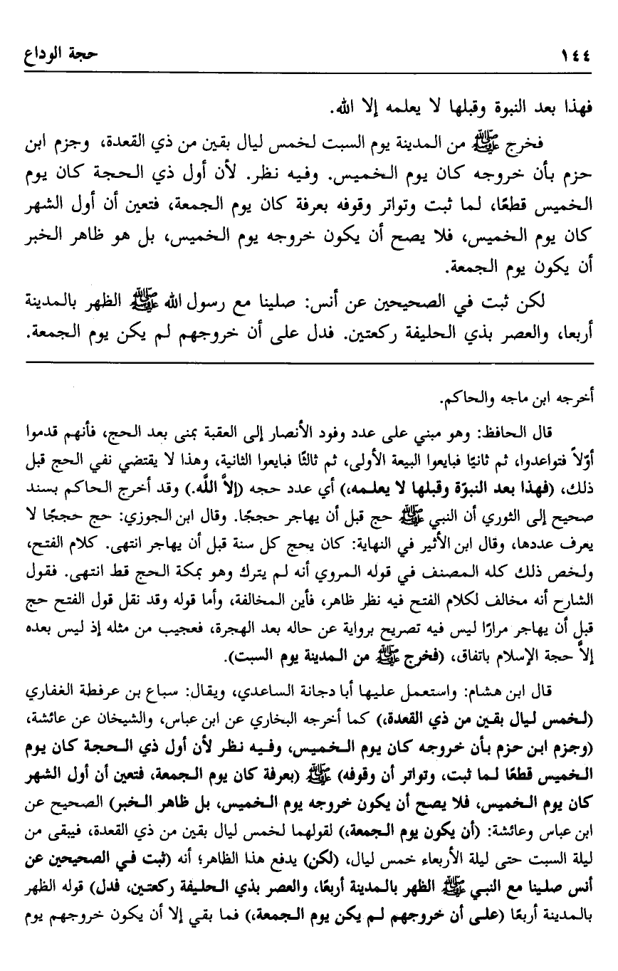 فخرج صلى الله عليه وسلم من المدينة يوم السبت لخمس ليال بقين من ذي القعدة، وجزم ابن حزم بأن خروجه كان يوم الخميس. وفيه نظر؛ لأن أول ذي الحجة كان يوم الخميس، قطعا، لما ثبت وتواتر وقوفه بعرفة كان يوم الجمعة، فتعين أن أول الشهر كان يوم الخميس، فلا يصح أن يكون خروجه يوم الخميس، بل هو ظاهر الخبر أن يكون يوم الجمعة.