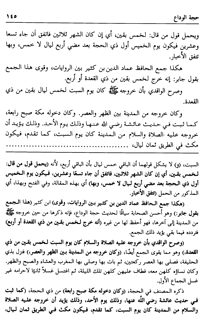 "هكذا جمع الحافظ عماد الدين بن كثير بين الروايات وقوى" ابن كثير "هذا الجمع بقول جابر:" وهو أحسن الصحابة سياقا لحديث حجة الوداع، فإنه ذكرها من حيث خروجه صلى الله عليه وسلم من المدينة إلى آخرها، فهو أحفظ لها من غيره "أنه خرج لخمس بقين من ذي القعدة أو أربع" فتردده فيما بقي يؤيد ذلك الجمع.