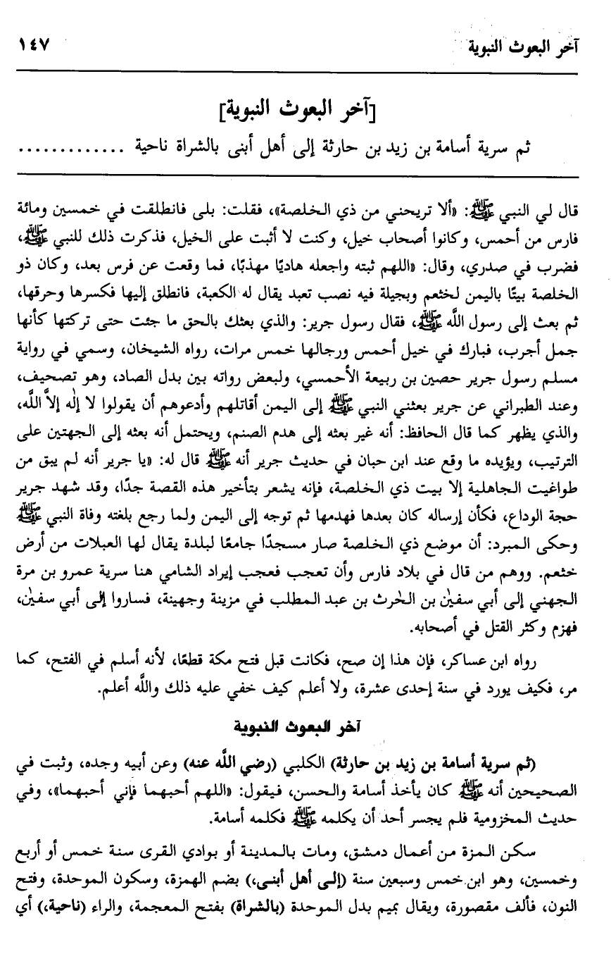 قال لي النبي صلى الله عليه وسلم: "ألا تريحني من ذي الخلصة" فقلت: بلى فانطلقت في خمسين ومائة فارس من أحمس وكانوا أصحاب خيل، وكنت لا أثبت على الخيل، فذكرت ذلك للنبي صلى الله عليه وسلم فضرب في صدري، وقال: "اللهم ثبته واجعله هاديا مهذبا"، فما وقعت عن فرس بعد، وكان ذو الخلصة بيتا باليمن لخثعم وبجيلة فيه نصب تعبد يقال له الكعبة، فانطلق إليها فكسرها وحرقها، ثم بعث إلى رسول الله صلى الله عليه وسلم، فقال رسول جرير، والذي بعثك بالحق ما جئت حتى تركتها كأنها جمل أجرب، فبارك في خيل أحمس ورجالها خمس مرات، رواه الشيخان، وسمي في رواية مسلم رسول جرير حصين بن ربيعة الأحمسي، ولبعض رواته بين بدل الصاد، وهو تصحيف، وعند الطبراني عن جرير بعثني النبي صلى الله عليه وسلم إلى اليمن أقاتلهم وأدعوهم أن يقولوا لا إله إلا الله، والذي يظهر كما قال الحافظ: أنه غير بعثه إلى هدم الصنم ويحتمل أنه بعثه إلى الجهتين على الترتيب ويؤيده ما وقع عند ابن حبان في حديث جرير أنه صلى الله عليه وسلم قال له: "يا جرير أنه لم يبق من طواغيت الجاهلية إلا بيت ذي الخلصة" فإنه يشعر بتأخير هذه القصة جدا، وقد شهد جرير حجة الوداع، فكأن إرساله كان بعدها فهدمها ثم توجه إلى اليمن ولما رجع بلغته وفاة النبي صلى الله عليه وسلم وحكى المبرد: أن موضع ذي الخلصة صار مسجدا جامعا لبلدة يقال لها العبلات من أرض خثعم ووهم من قال في بلاد فارس وأن تعجب فعجب إيراد الشامي هنا سرية عمرو بن مرة الجهني إلى أبي سفيان بن الحارث بن عبد المطلب في مزينة وجهينة، فساروا إلى أبي سفيان، فهزم وكثر القتل في أصحابه.
