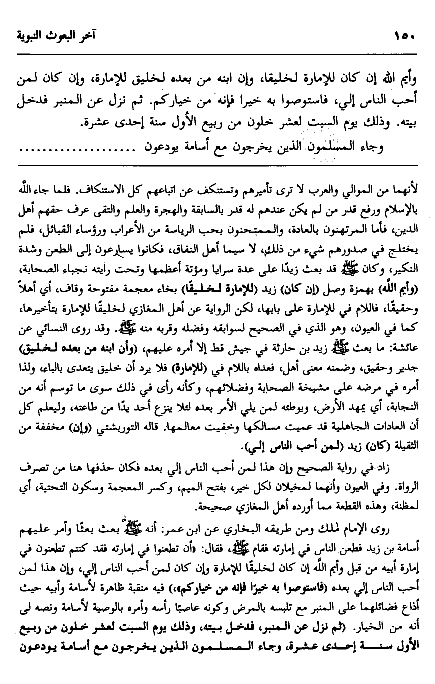 وايم الله إن كان للإمارة لخليقا، وإن ابنه من بعده لخليق للإمارة وإن كان لمن أحب الناس إليَّ، فاستوصوا به خيرا فإنه من خياركم"، ثم نزل عن المنبر فدخل بيته. وذلك يوم السبت لعشر خلون من ربيع الأول سنة إحدى عشرة.