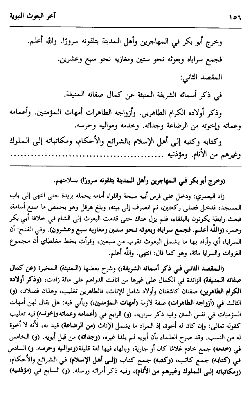 "المقصد الثاني في ذكر أسمائه الشريفة" وشرح بعضها "المنبئة" المخبرة "عن كمال صفاته المنيفة" الزائدة في الكمال على غيرها من أنافت الدراهم على مائة زادت، "وذكر أولاده الكرام الطاهرين" صفتان كاشفتان وأولاد شامل للإناث، فالطاهرين تغليب وهذان فصلان، "و" الثالث في "أزواجه الطاهرات" صفة لازمة "أمهات المؤمنين" ويأتي فيه: هل يقال لهن أمهات المؤمنات في نفس المتن وفيه ذكر سراريه "و" الرابع في أعمامه وعماته وإخوته" فيه تغليب كقوله تعالى: {فَإِنْ كَانَ لَهُ إِخْوَةٌ} ؛ إذ المراد ما يشمل الإناث "من الرضاعة" قيد به؛ لأنه لا إخوة له من النسب، وقد صرح العلماء بأن أبوابه لم يلدا غيره "وجداته" من قبل أبويه. "و" الخامس في "خدمه" جمع خادم غلاما كان أو جارية، وبالهاء فيها لغة قليلة "وموالية وحرسه. و" السادس في "كتابه" جمع كاتب، "وكتبه" جمع كتاب "إلى أهل الإسلام" في الشرائع والأحكام "ومكاتباته إلى الملوك وغيرهم من الأنام" وفيه ذكر أمرائه ورسله. "و" السابع في "مؤذنيه"
