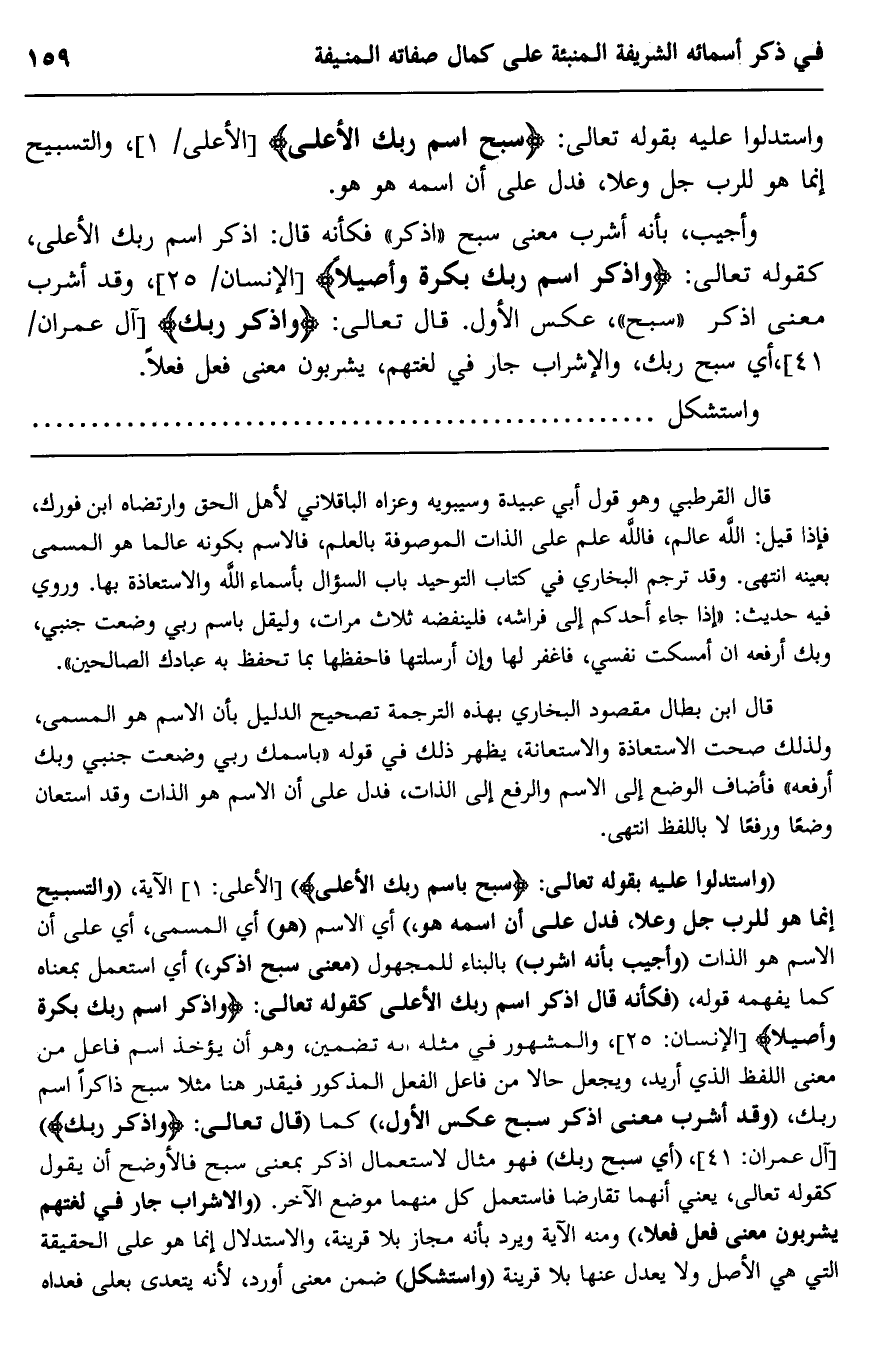 واستدلوا عليه بقوله تعالى: {سَبِّحِ اسْمَ رَبِّكَ الْأَعْلَى} [الأعلى: 1] الآية: "والتسبيح إنما هو للرب جل وعلا، فدل على أن اسمه هو، "أي الاسم "هو" أي المسمى، أي على أن الاسم هو الذات "وأجيب بأنه اشرب" بالبناء للمجهول معنى سبح اذكر، أي استعمل بمعناه كما يفهمه قوله، "فكأنه قال اذكر اسم ربك الأعلى كقوله تعالى: {وَاذْكُرِ اسْمَ رَبِّكَ بُكْرَةً وَأَصِيلًا} " [الإنسان: 25] والمشهور في مثله أنه تضمين وهو أنه يؤخذ اسم فاعل من معنى اللفظ الذي أريد ويجعل حالا من فاعل الفعل المذكور فيقدر هنا مثلا سبح ذاكرا اسم ربك، وقد أشرب معنى اذكر سبح عكس الأول "كما قال تعالى: {وَاذْكُرْ رَبَّكَ} " [آل عمران: 41] "أي سبح ربك" فهو مثال لاستعمال اذكر بمعنى سبح فالأوضح أن يقول كقوله تعالى، يعني أنهما تقارضا فاستعمل كل منهما موضع الآخر. "والإشراب جار في لغتهم يشربون معنى فعل فعلا" ومنه الآية ويرد بأنه مجاز بلا قرينة، والاستدلال إنما هو على الحقيقة التي هي الأصل، ولا يعدل عنها بلا قرينة "واستشكل" ضمن معنى أورد؛ لأنه يتعدى بعلى فعداه