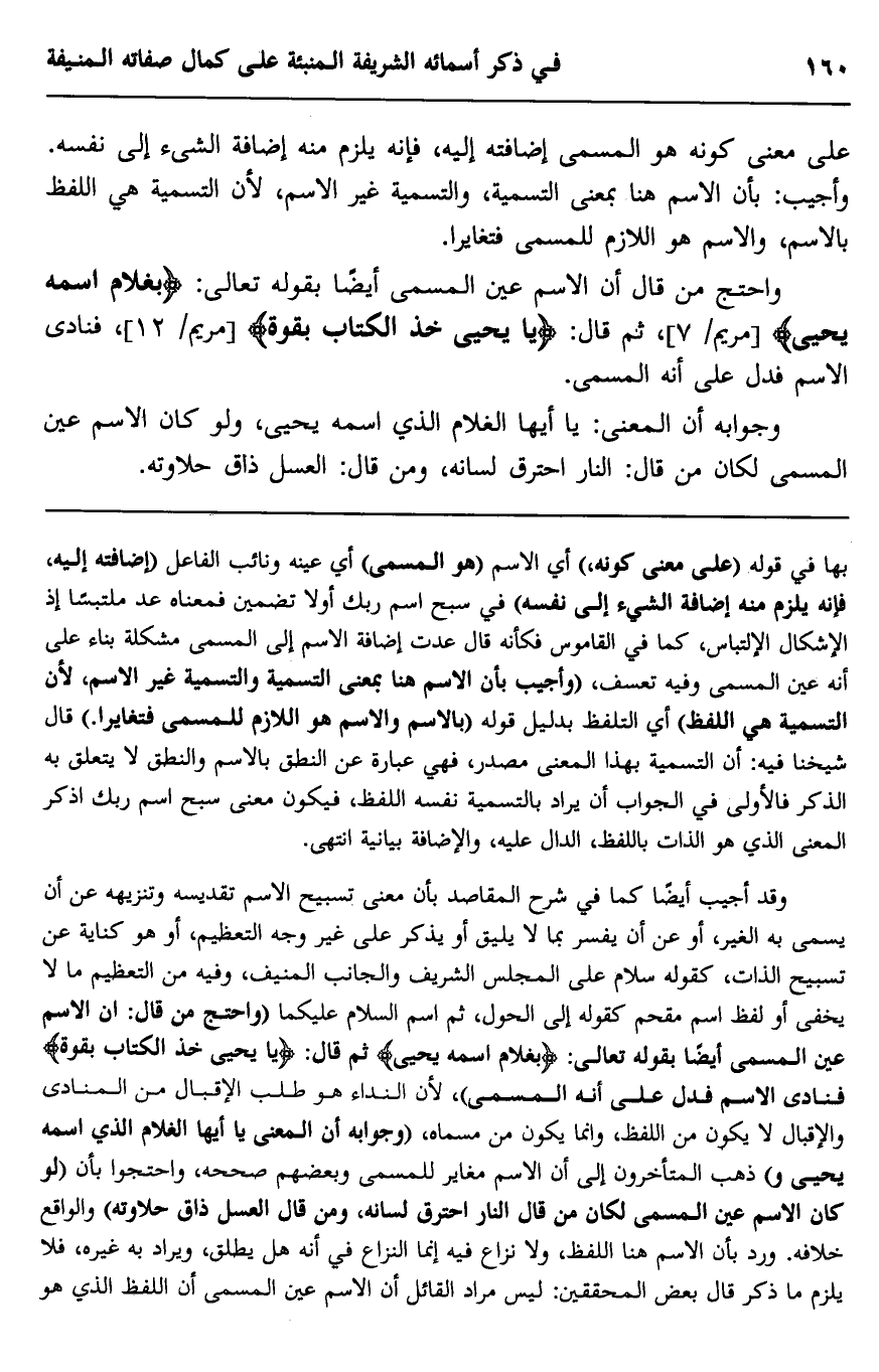 واحتج من قال: إن الاسم عين المسمى أيضا بقوله تعالى: {بِغُلَامٍ اسْمُهُ يَحْيَى} [مريم: 7] ثم قال: {يَا يَحْيَى خُذِ الْكِتَابَ بِقُوَّةٍ} [مريم: 12] ، فنادى الاسم فدل على أنه المسمى.