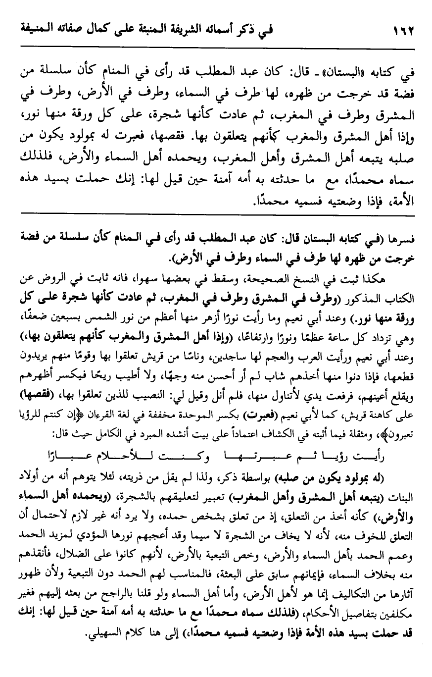 في كتابه "البستان"- قال: كان عبد المطلب قد رأى في المنام كأن سلسلة من فضة قد خرجت من ظهره، لها طرف في السماء، وطرف في الأرض، وطرف في المشرق وطرف في المغرب، ثم عادت كأنها شجرة، على كل ورقة منها نور، وإذا أهل المشرق والمغرب كأنهم يتعلقون بها. فقصها، فعبرت له بمولود يكون من صلبه يتبعه أهل المشرق وأهل المغرب، ويحمده أهل السماء والأرض، فلذلك سماه محمدا، مع ما حدثته به أمه آمنة حين قيل لها: إنك حملت بسيد هذه الأمة، فإذا وضعتيه فسميه محمدا.