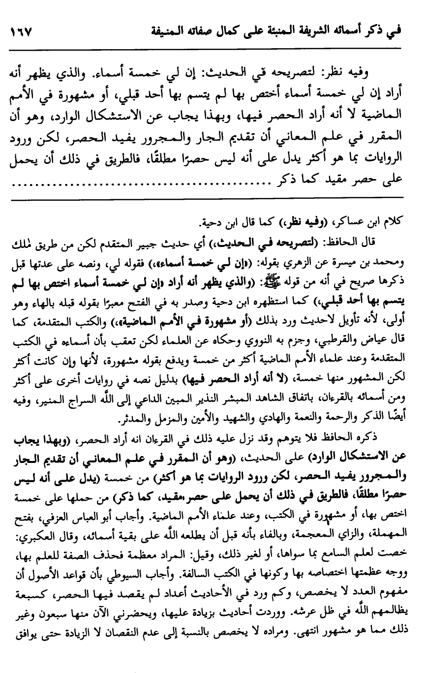 وفيه نظر: لتصريحه في الحديث: "إن لي خمسة أسماء". والذي يظهر أنه أراد إن لي خمسة أسماء أختص بها لم يتسم بها أحد قبلي، أو مشهورة في الأمم الماضية لا أنه أراد الحصر فيها، وبهذا يجاب عن الاستشكال الوارد، وهو أن المقرر في علم المعاني أن تقديم الجار والمجرور يفيد الحصر، لكن ورود الروايات بما هو أكثر