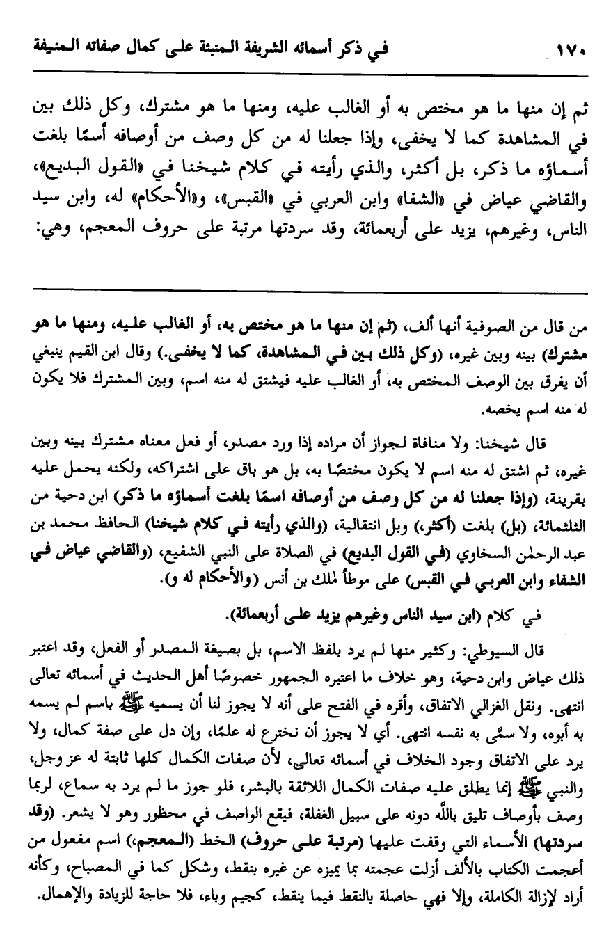 ثم إن منها ما هو مختص به أو الغالب عليه، ومنها ما هو مشترك، وكل ذلك بين في المشاهدة كما لا يخفى، وإذا جعلنا له من كل وصف من أوصافه اسما بلغت أسماؤه ما ذكر، بل أكثر، والذي رأيته في كلام شيخنا في "القول البديع"، والقاضي عياض في "الشفا" وابن العربي في "القبس"، و"الأحكام" له، وابن سيد الناس، وغيرهم، يزيد على أربعمائة، وقد سردتها مرتبة على حروف المعجم، وهي: