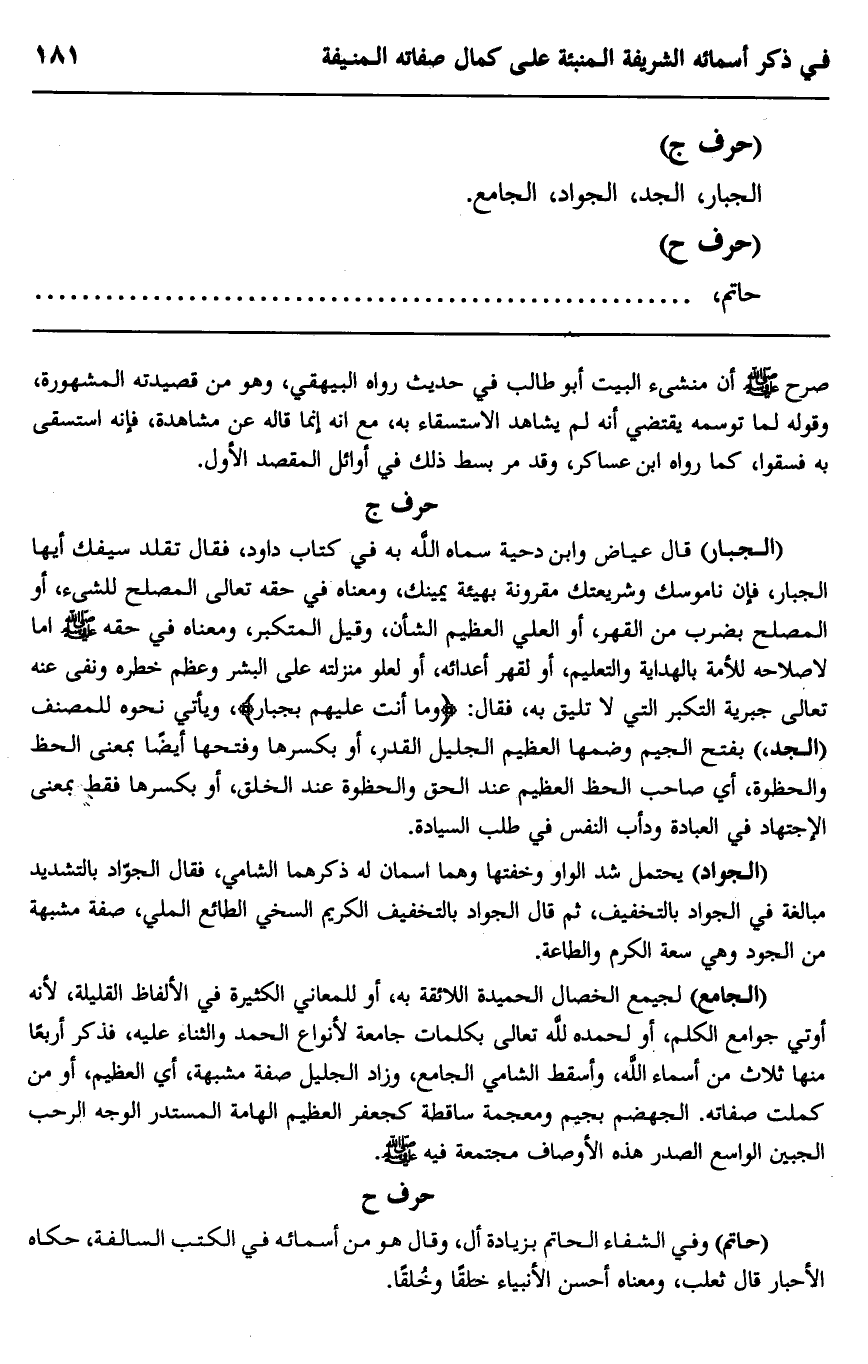 "الجامع" لجميع الخصال الحميدة اللائقة به، أو للمعاني الكثيرة في الألفاظ القليلة؛ لأنه أوتي جوامع الكلم، أو لحمده لله تعالى بكلمات جامعة لأنواع الحمد والثناء عليه، فذكر أربعا منها ثلاث من أسماء الله، وأسقط الشامي الجامع، وزاد الجليل صفة مشبهة، أي العظيم، أو من كملت صفاته. الجهضم بجيم ومعجمة ساقطة كجعفر العظيم الهامة المستدر الوجه الرحب الجبين الواسع الصدر هذه الأوصاف مجتمعة فيه صلى الله عليه وسلم.