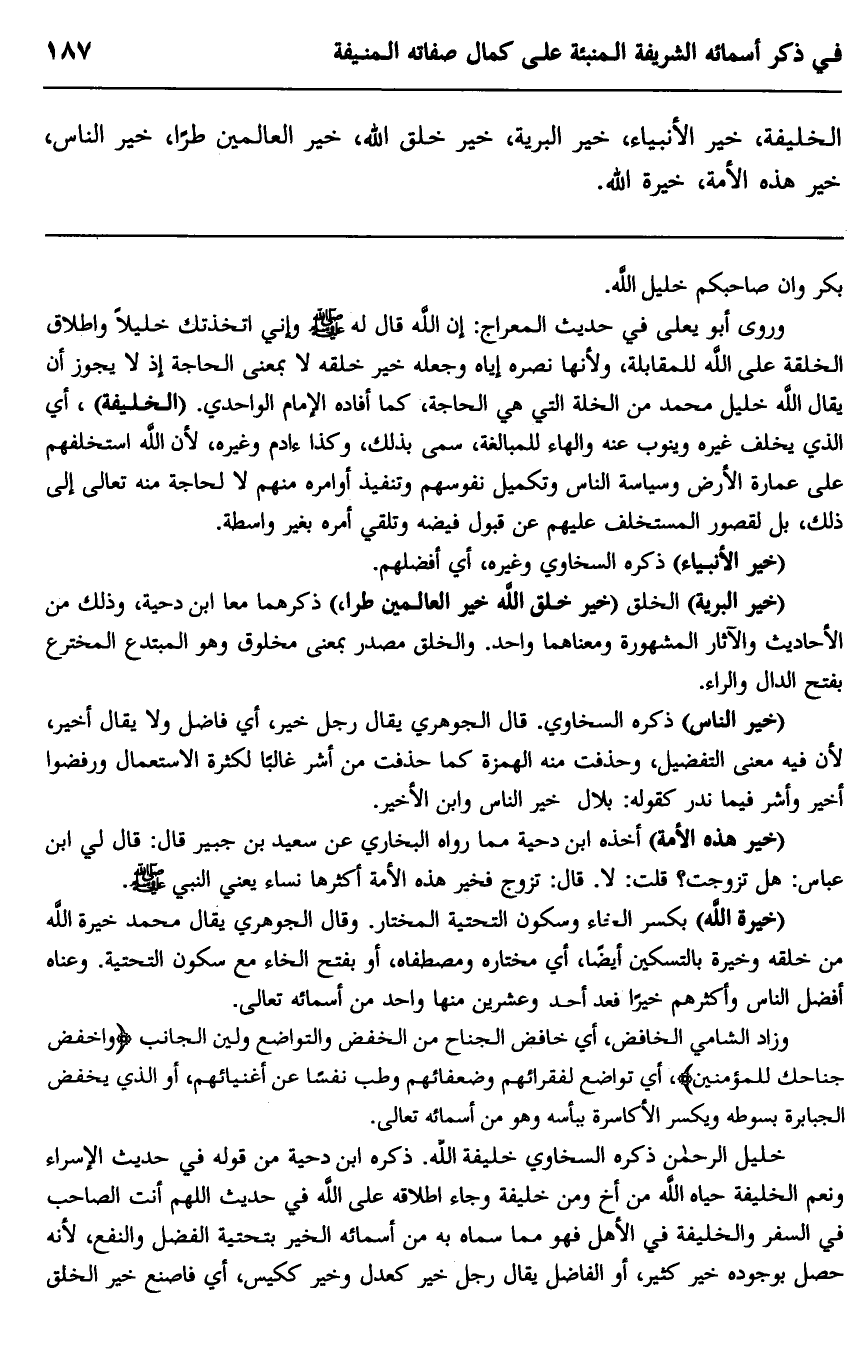 "خير البرية" الخلق "خير خلق الله خير العالمين طرا" ذكرهما معا ابن دحية وذلك من الأحاديث والآثار المشهورة ومعناهما واحد. والخلق مصدر بمعنى مخلوق وهو المبتدع المخترع بفتح الدال والراء.