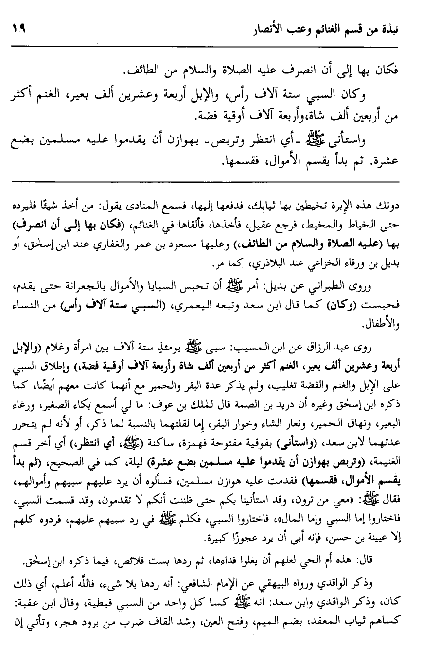 روى عبد الرزاق عن ابن المسيب: سبى صلى الله عليه وسلم يومئذ ستة آلاف بين امرأة وغلام "والإبل أربعة وعشرين ألف بعير، الغنم أكثر من أربعين ألف شاة وأربعة آلاف أوقية فضة"، وإطلاق السبي على الإبل والغنم، والفضة تغليب، ولم يذكر عدة البقر والحمير مع أنهما كانت معهم أيضا، كما ذكره ابن إسحاق وغيره أن دريد بن الصمة قال لمالك بن عوف: ما لي أسمع بكاء الصغير، ورغاء البعير، ونهاق الحمير، ونعار الشاء وخوار البقر، إما لقلتهما بالنسبة لما ذكر، أو؛ لأنه لم يتحرر عدتهما لابن سعد، "واستأنى" بفوقية مفتوحة فهمزة، ساكنة "صلى الله عليه وسلم" أي انتظر،" أي أخر قسم الغنيمة، "وتربص بهوازن أن يقدموا عليه هوازن مسلمين، فسألوه أن يرد عليهم سبيهم وأموالهم، فقال صلى الله عليه وسلم: "معي من ترون، وقد استأنينا بكم حتى ظننت أنكم لا تقدمون، وقد قسمت السبي فاختاروا إما السبي وإما المال"، فاختاروا السبي، فكلم صلى الله عليه وسلم في رد سبيهم عليهم، فردوه كلهم إلا عيينة بن حصن، فإنه أبى أن يرد عجوزا كبيرة.