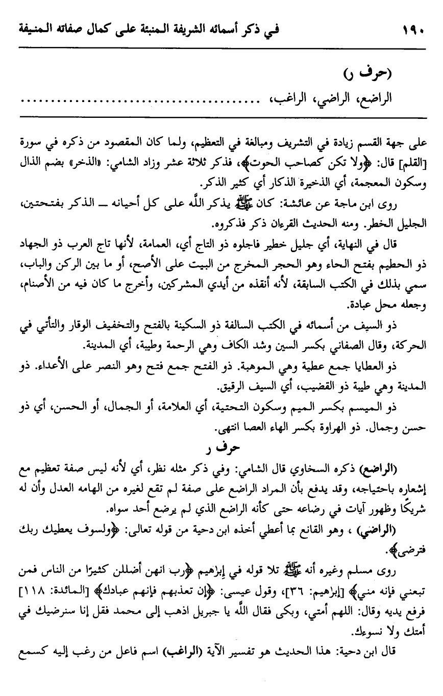 "الراضي"، وهو القانع بما أعطى أخذه ابن دحية من قوله تعالى: {وَلَسَوْفَ يُعْطِيكَ رَبُّكَ فَتَرْضَى} .