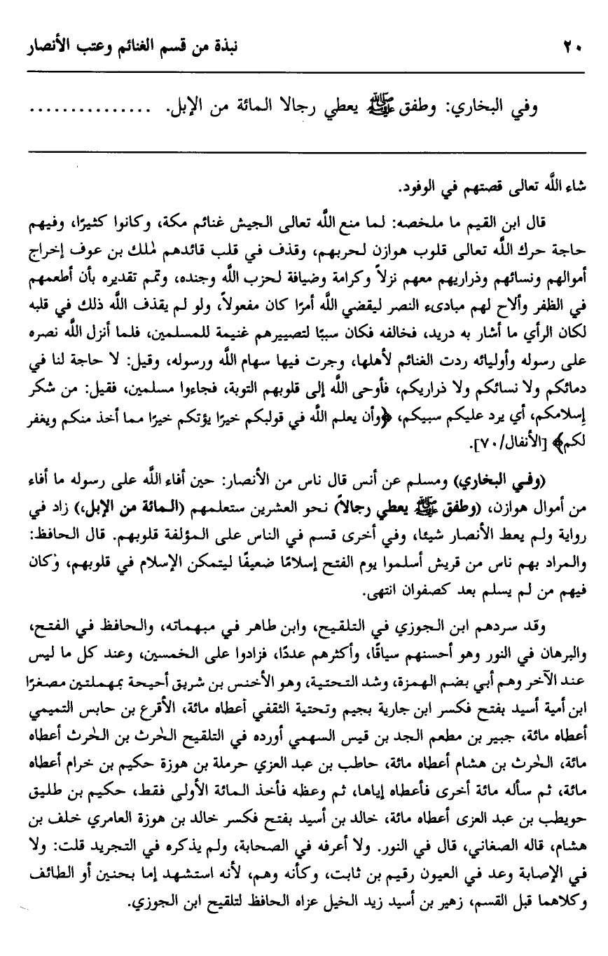 "وفي البخاري" ومسلم عن أنس قال ناس من الأنصار: حين أفاء الله على رسوله ما أفاء من أموال هوازن "وطفق صلى الله عليه وسلم" يعطي رجالا" نحو العشرين ستعلمهم "المائة من الإبل"، زاد في رواية ولم يعط الأنصار شيئا، وفي أخرى قسم في الناس على المؤلفة قلوبهم، قال الحافظ: والمراد بهم ناس من قريش أسلموا يوم الفتح إسلاما ضعيفا ليتمكن الإسلام في قلوبهم، وكان فيهم من لم يسلم بعد كصفوان. ا. هـ.